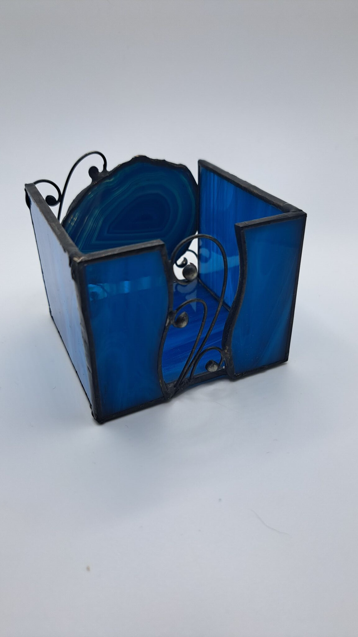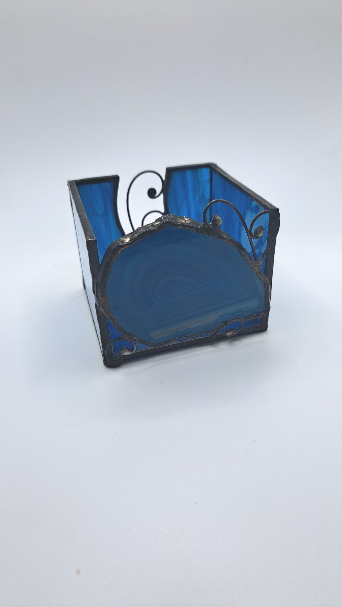 Originální ručně vyrobený modrý svícen se zajímavým achátem a decentní stínohrou s jednoduchým motivem.