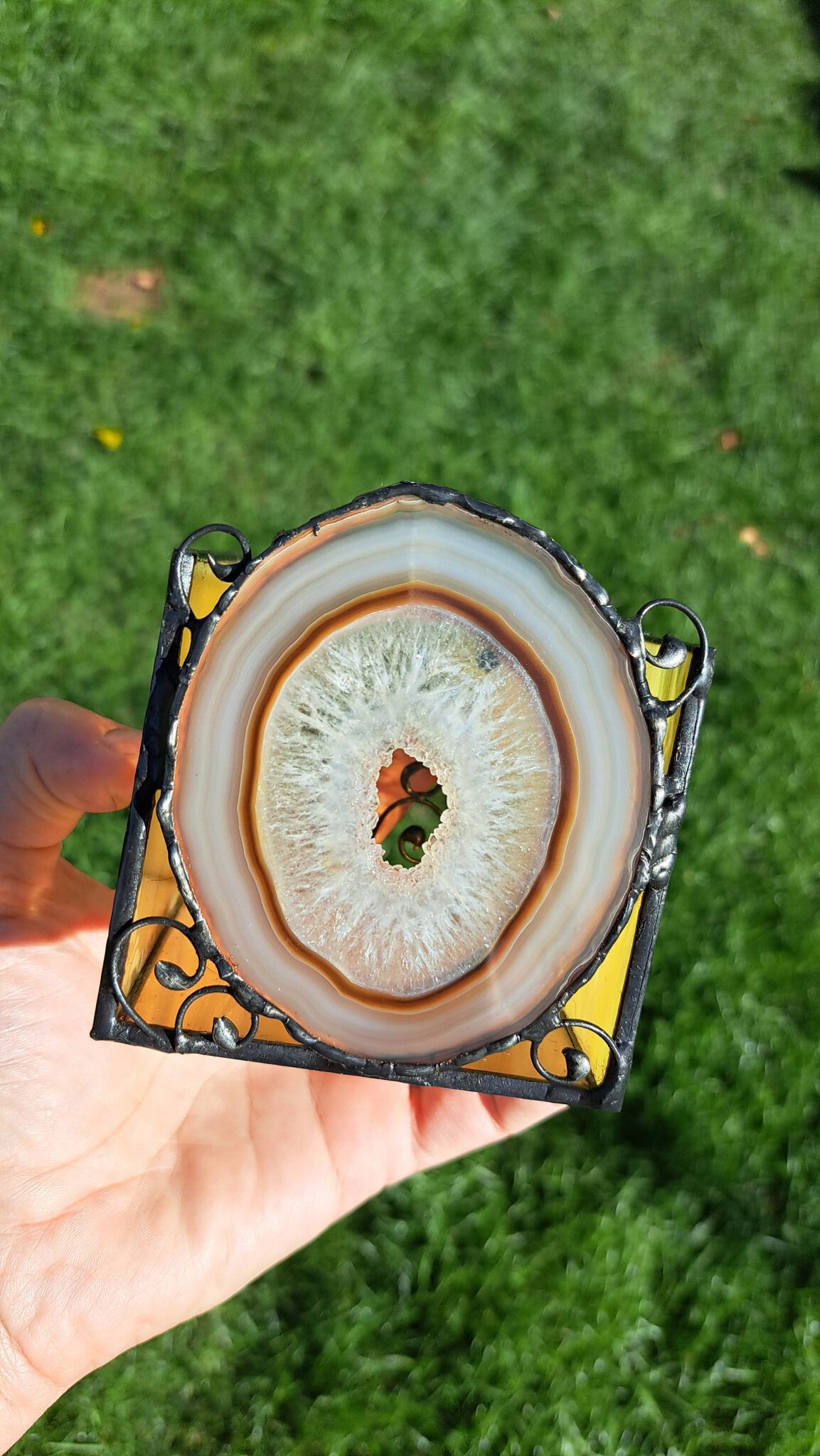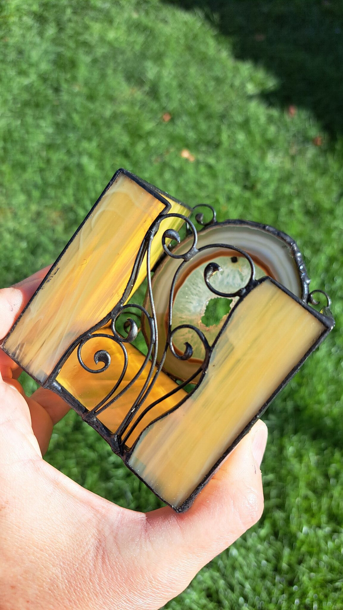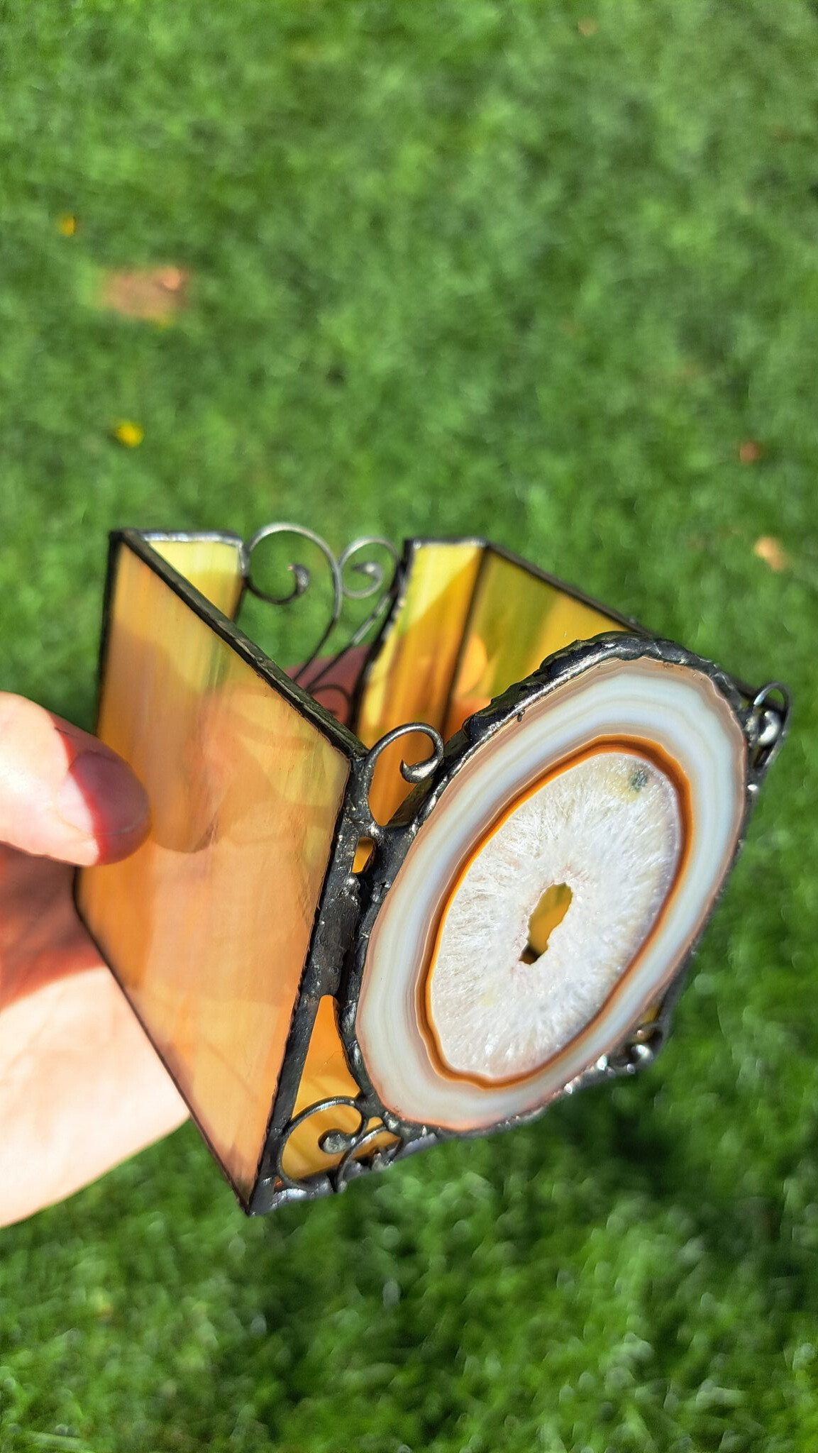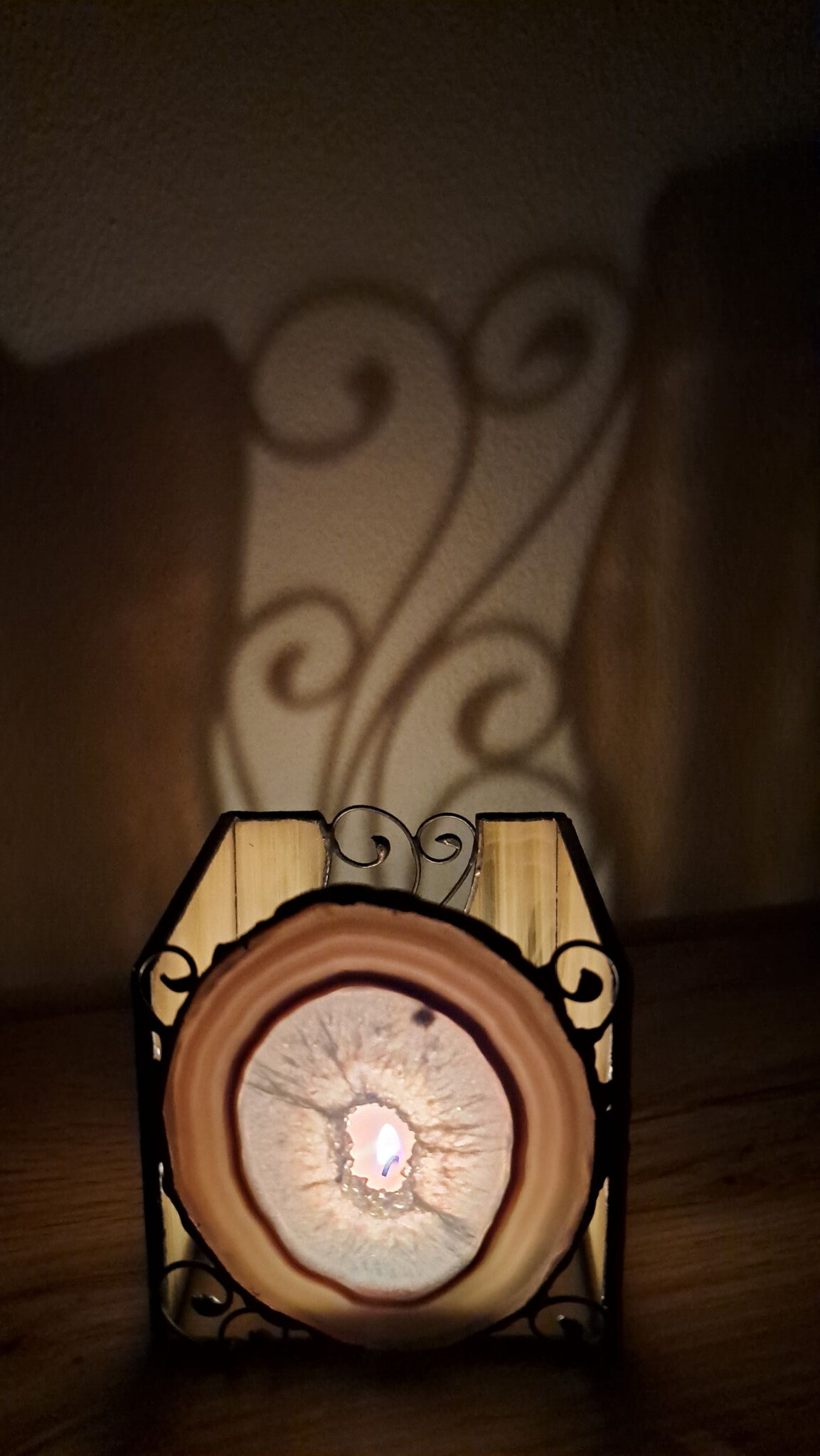 I achát s působivými vrstvami může být zakomponován do svícnu. Vznikl tím jedinečný úkaz, kdy zepředu bude zářit achát a vzadu svoje kouzlo rozehraje stínohra přírodních motivů. A stačí jen zapálit čajovou svíčku v blízkosti stěny, uvařit si čaj , v klidu relaxovat a nechat se okouzlit.