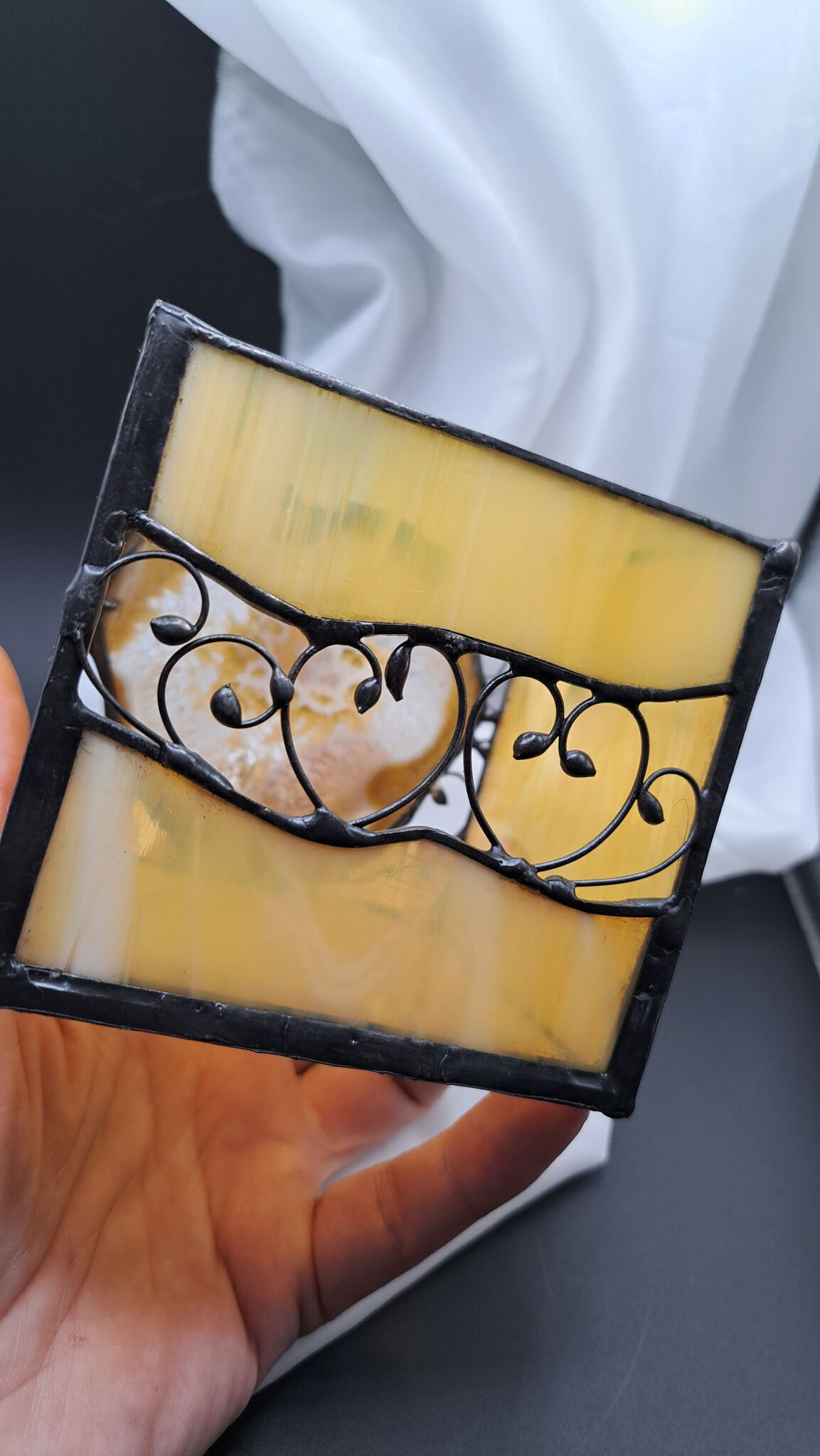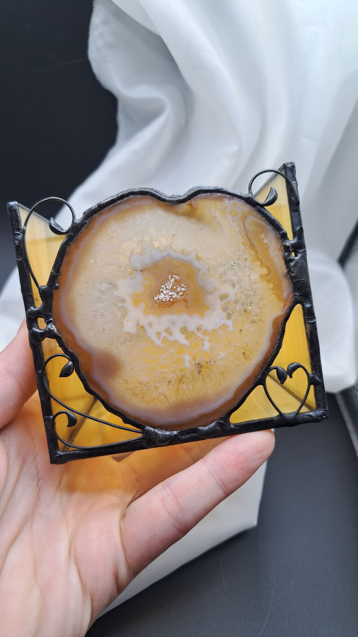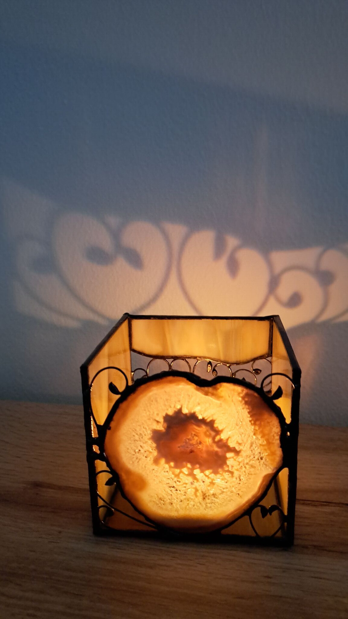 Originální ručně vyrobený svícen z vitrážového skla, achátového plátku a drátů vytváří jemnou stínohru, ve které se zobrazí přírodní motiv. Jako malé kouzlo na zdi pro příjemné a romantické večery.