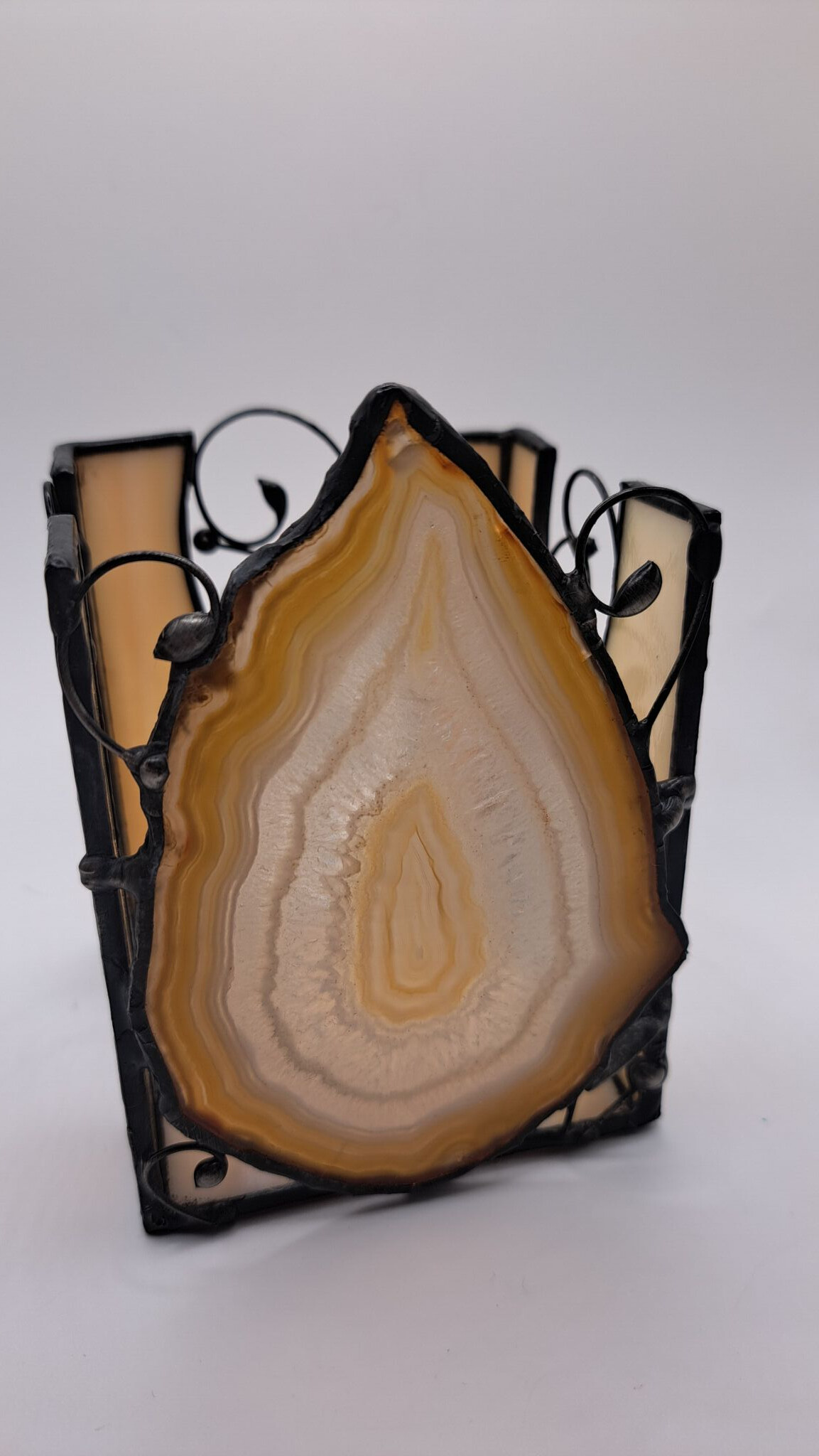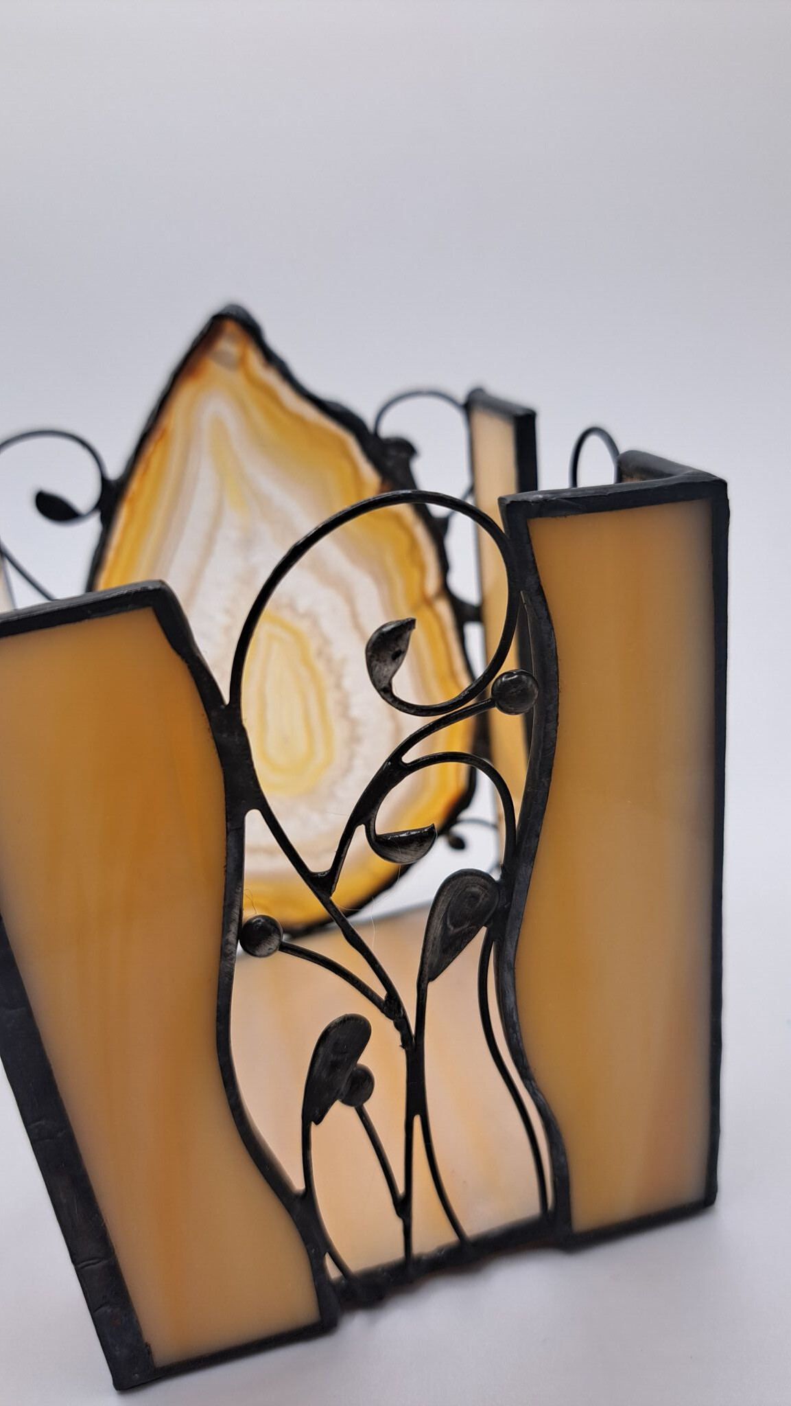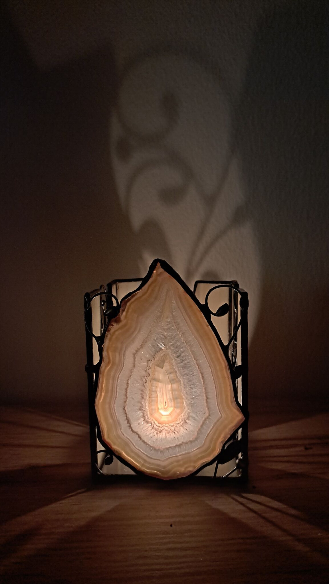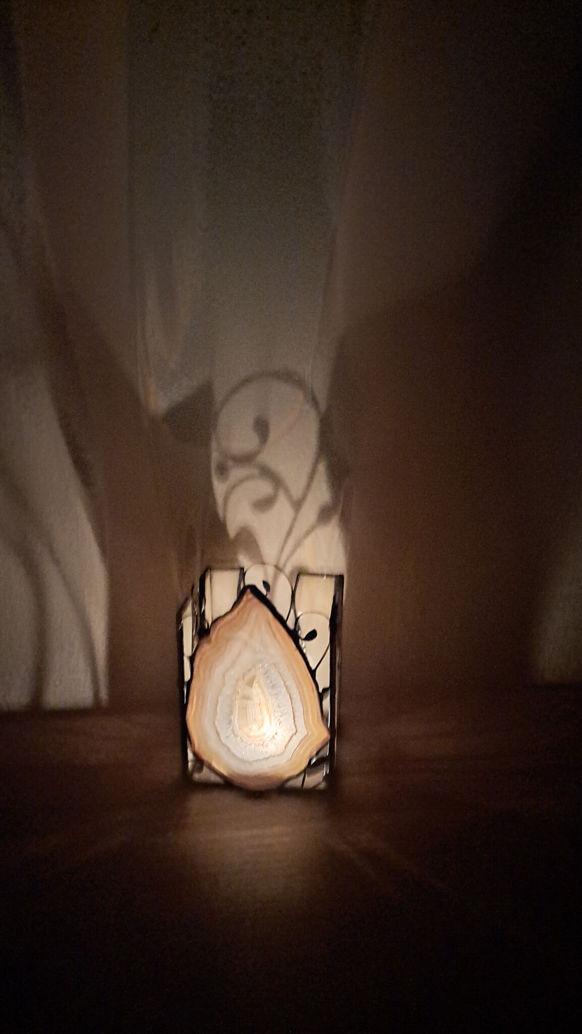 Kouzelný achátový svícen s bohatou stínohrou na třech stranách. Užijte si nádhernou večerní pohodu u tohoto svícnu s přírodním achátem, stačí rozsvítit čajovou svíčku a svícen postavit blízko zdi.