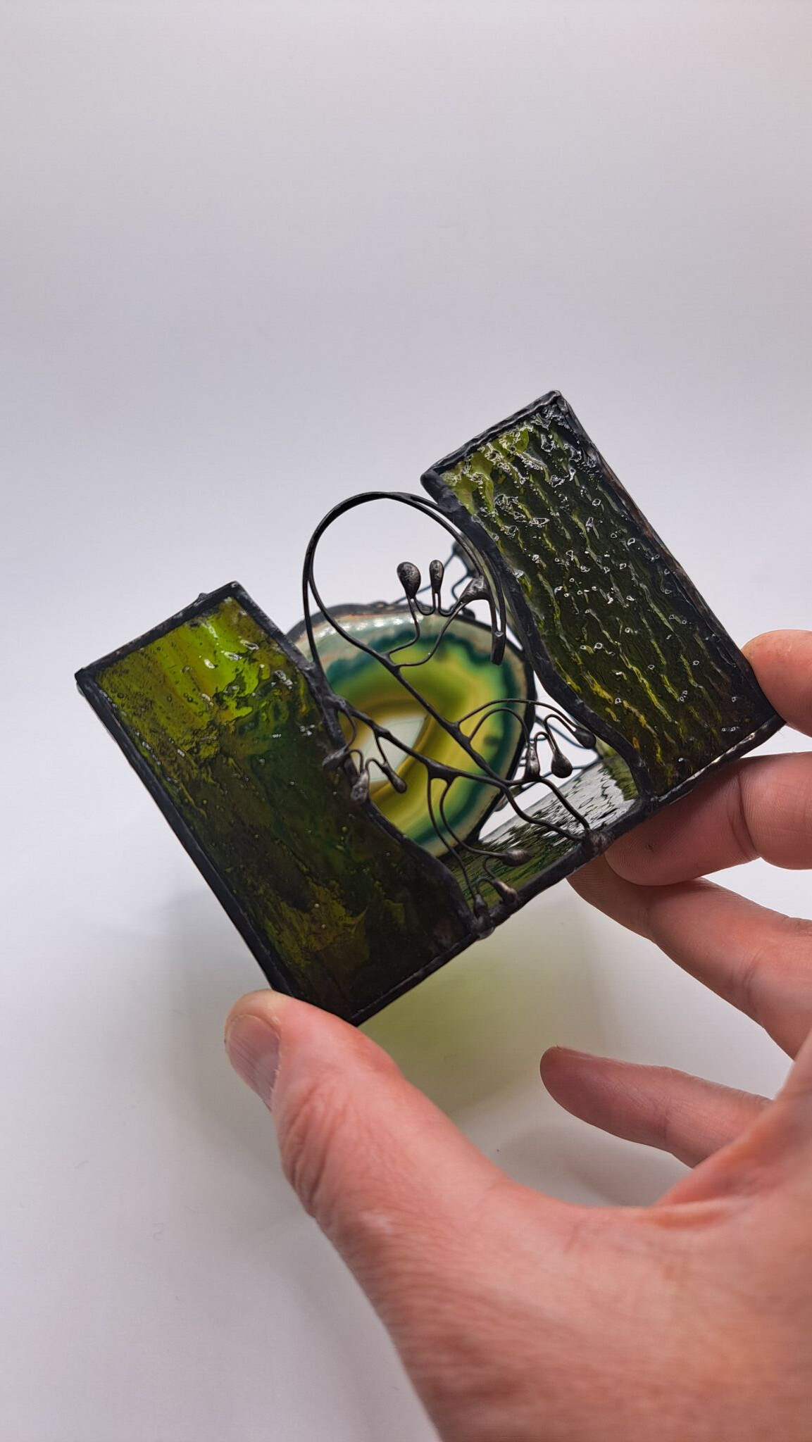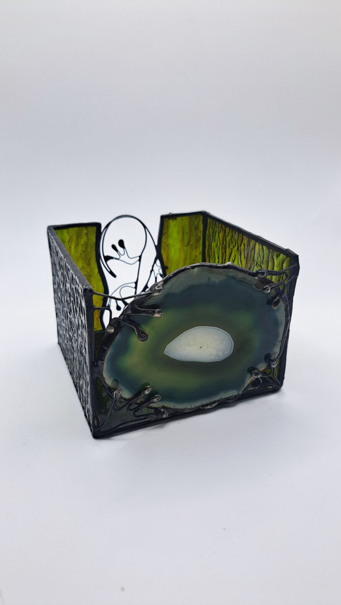 Ručně vyrobený skleněný svícen s achátem a stínohrou ještěrky. Tento přírodní motiv Vás rozveselí a krásně zelený achát přidá dobrou náladu. Rozsviťte si svícen s ještěrkou a vzpomeňte na letní setkání s malým rychlým tvorečkem v trávě.