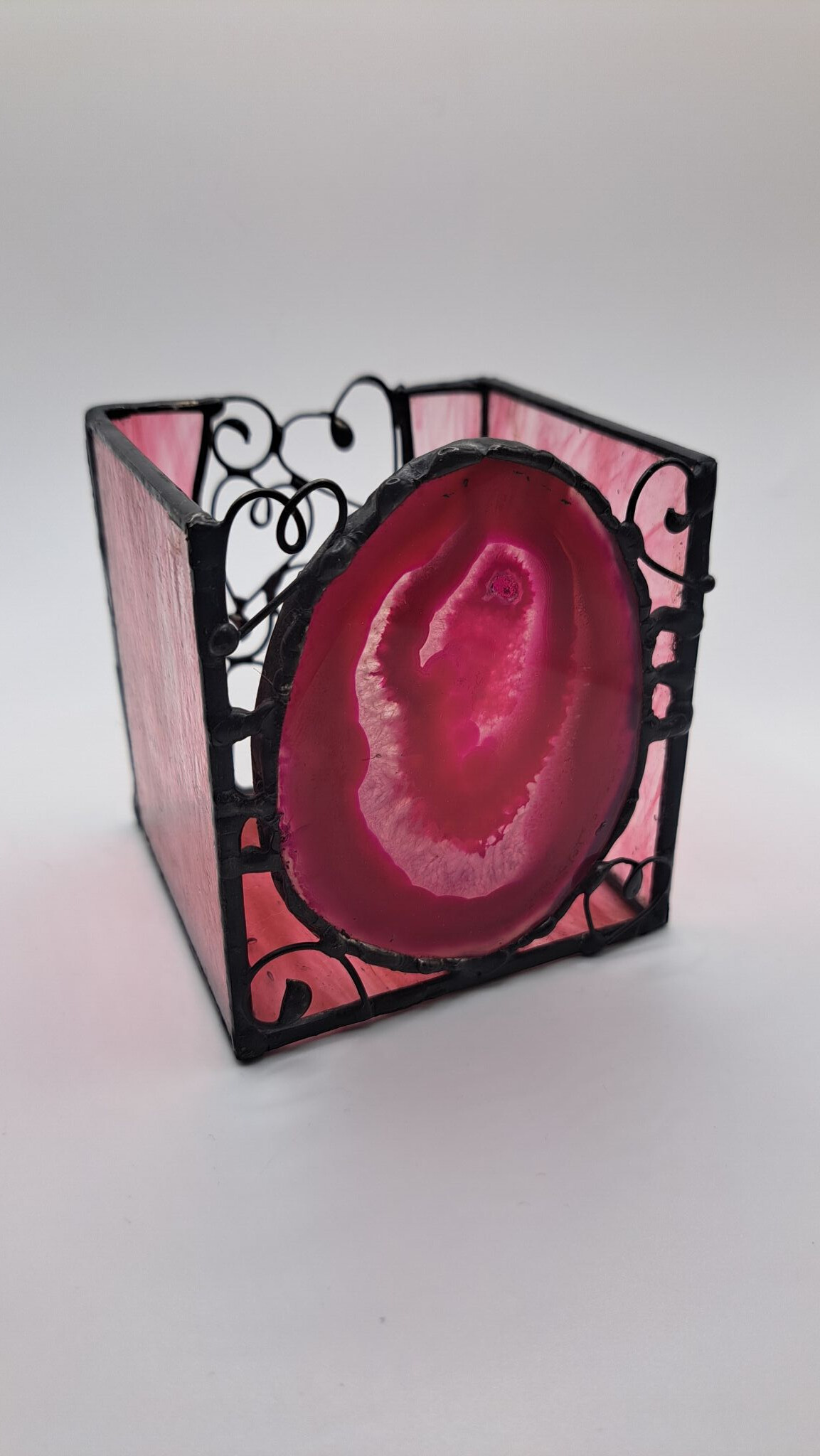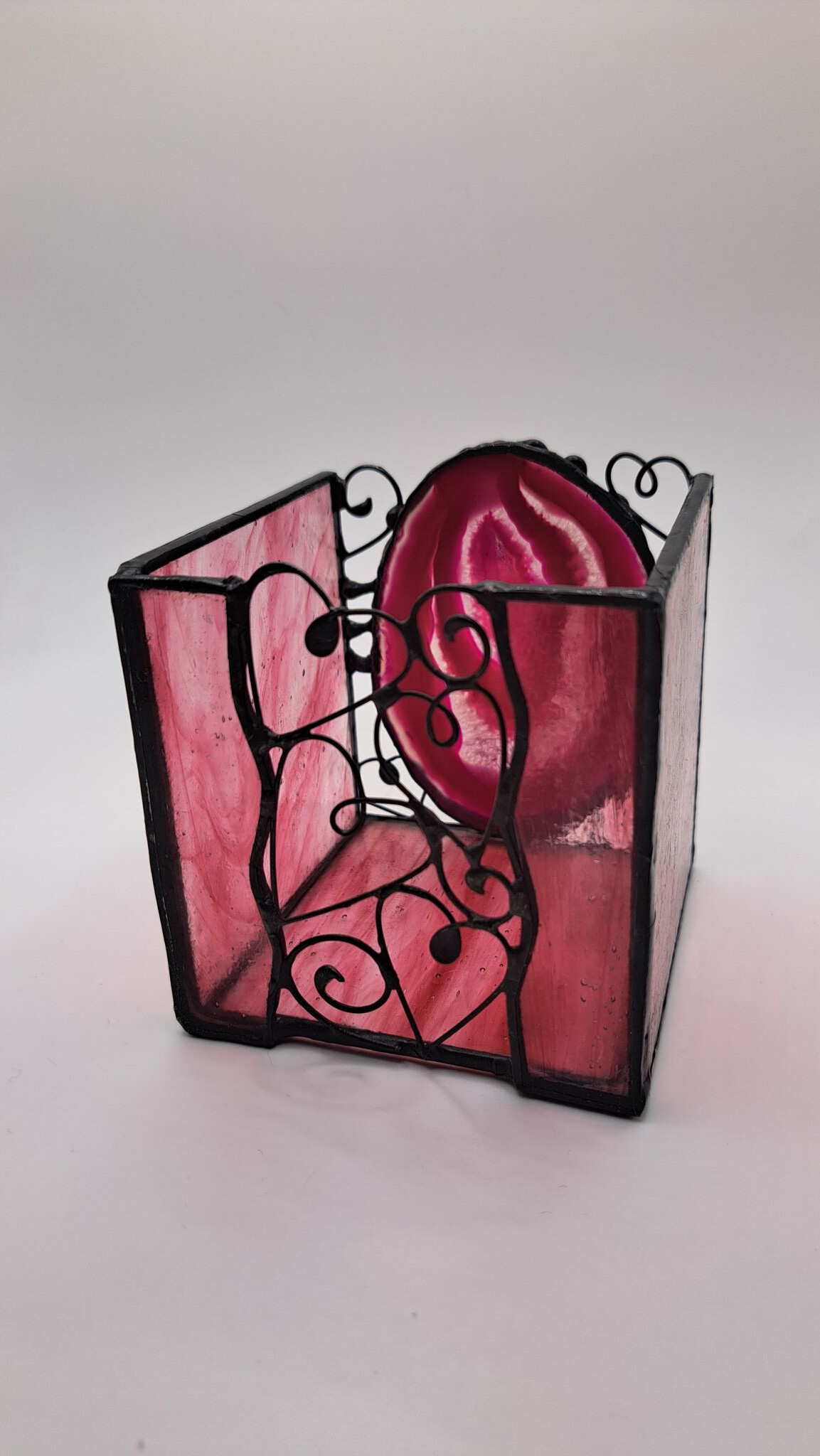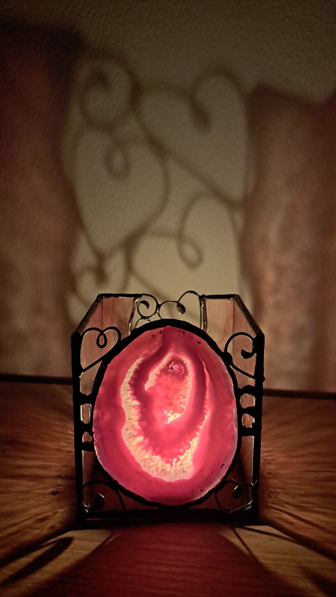 Ručně vyrobený achátový svícen v růžové barvě. krásné žíhané růžové sklo a srdíčková stínohra, vykouzlí něžnou atmosféru pro krásný večer.