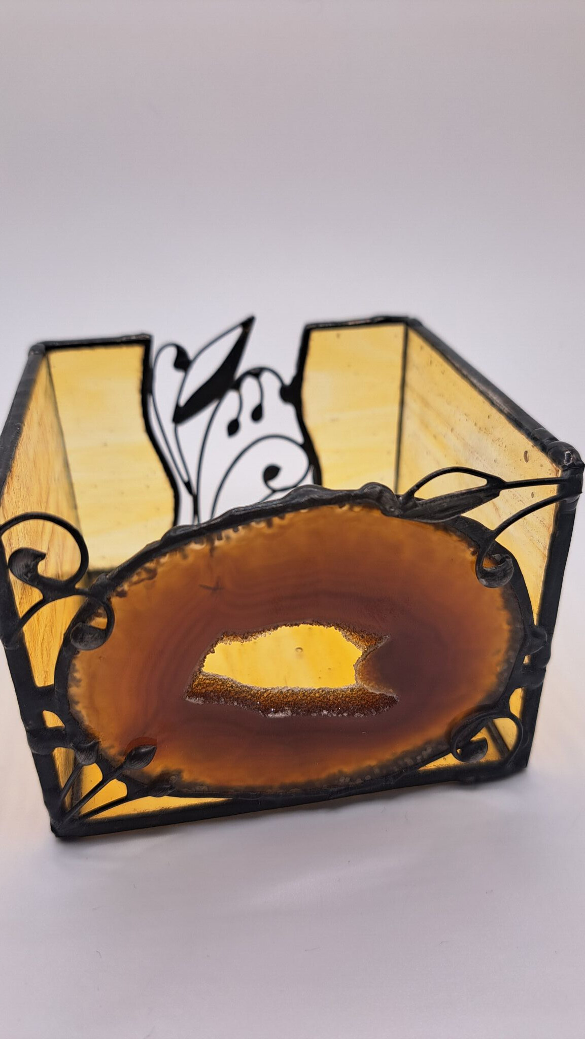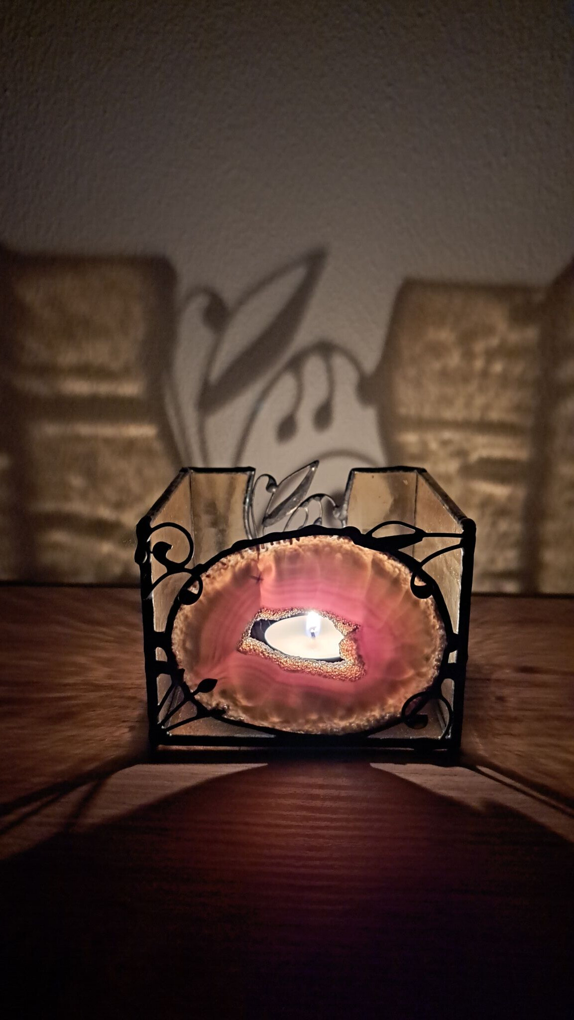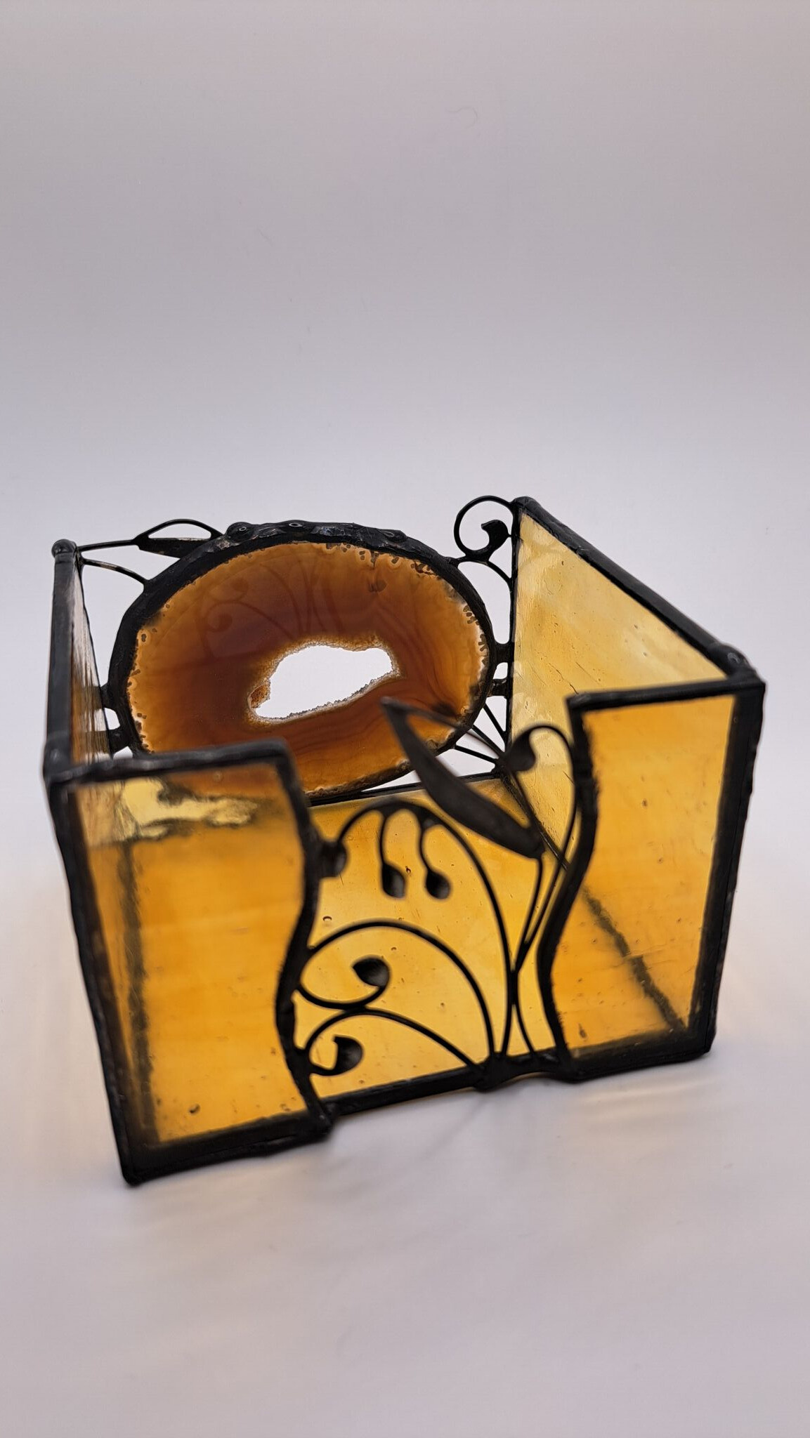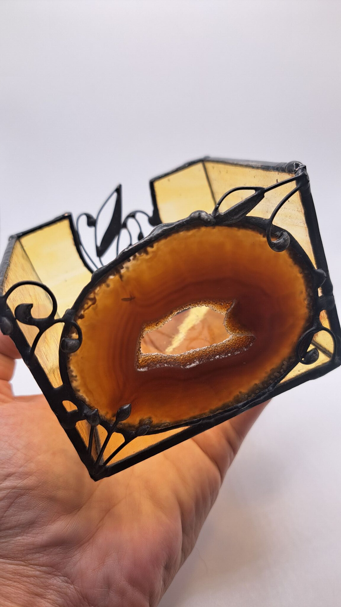 Krásný achát ve svícnu z medově zlatavého skla a rostlinným motivem.