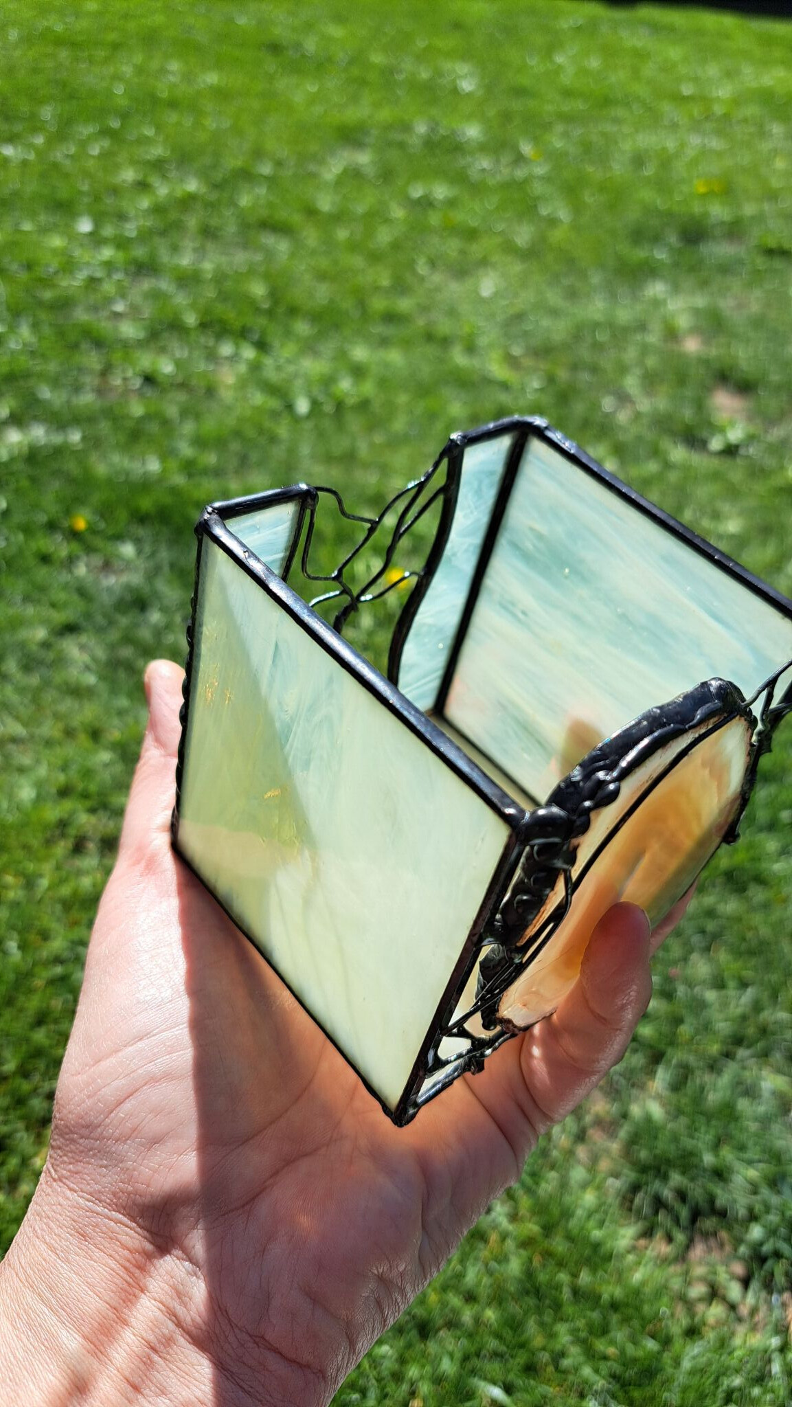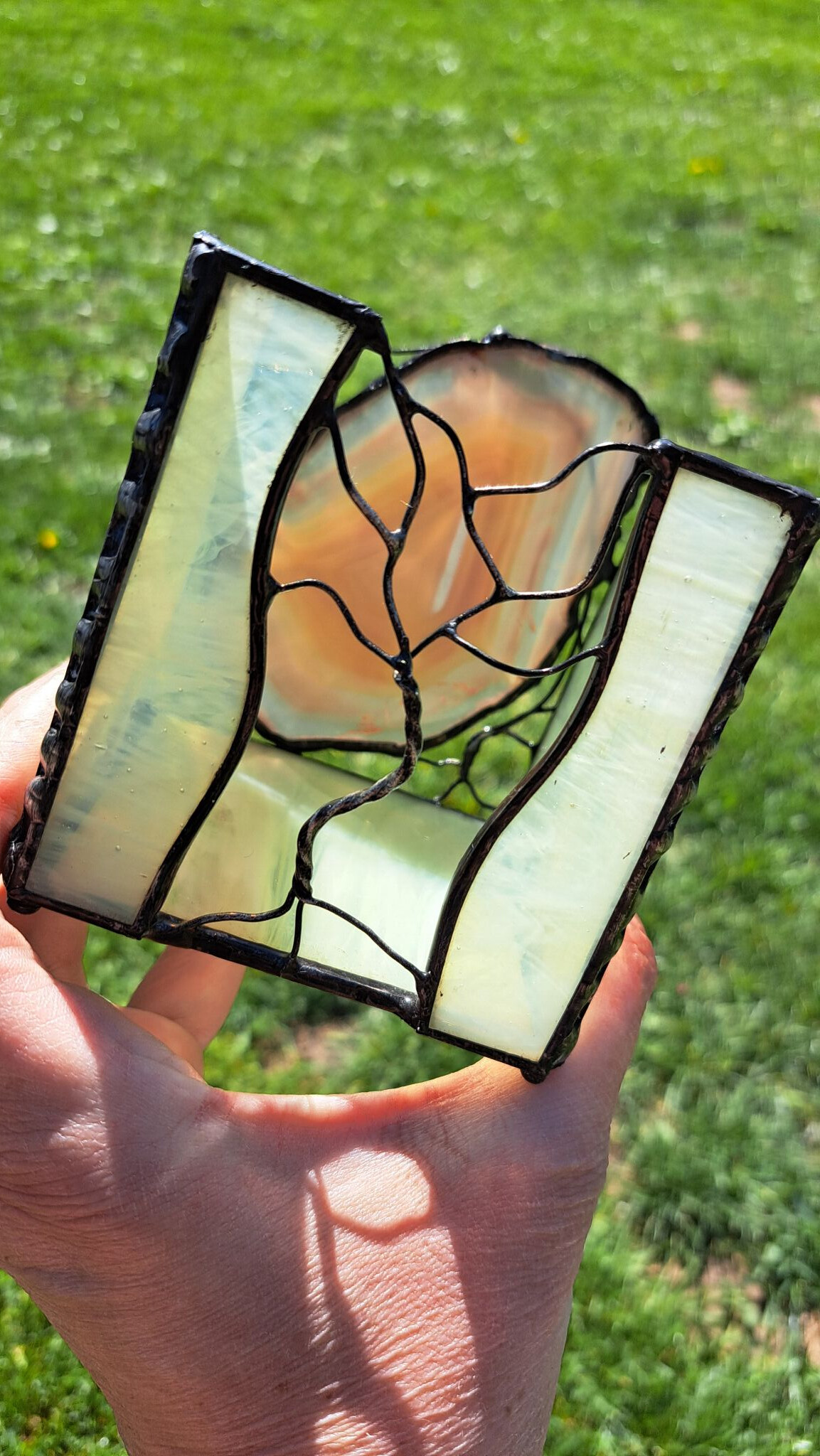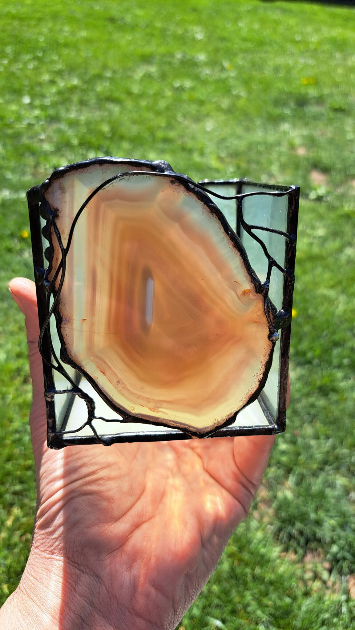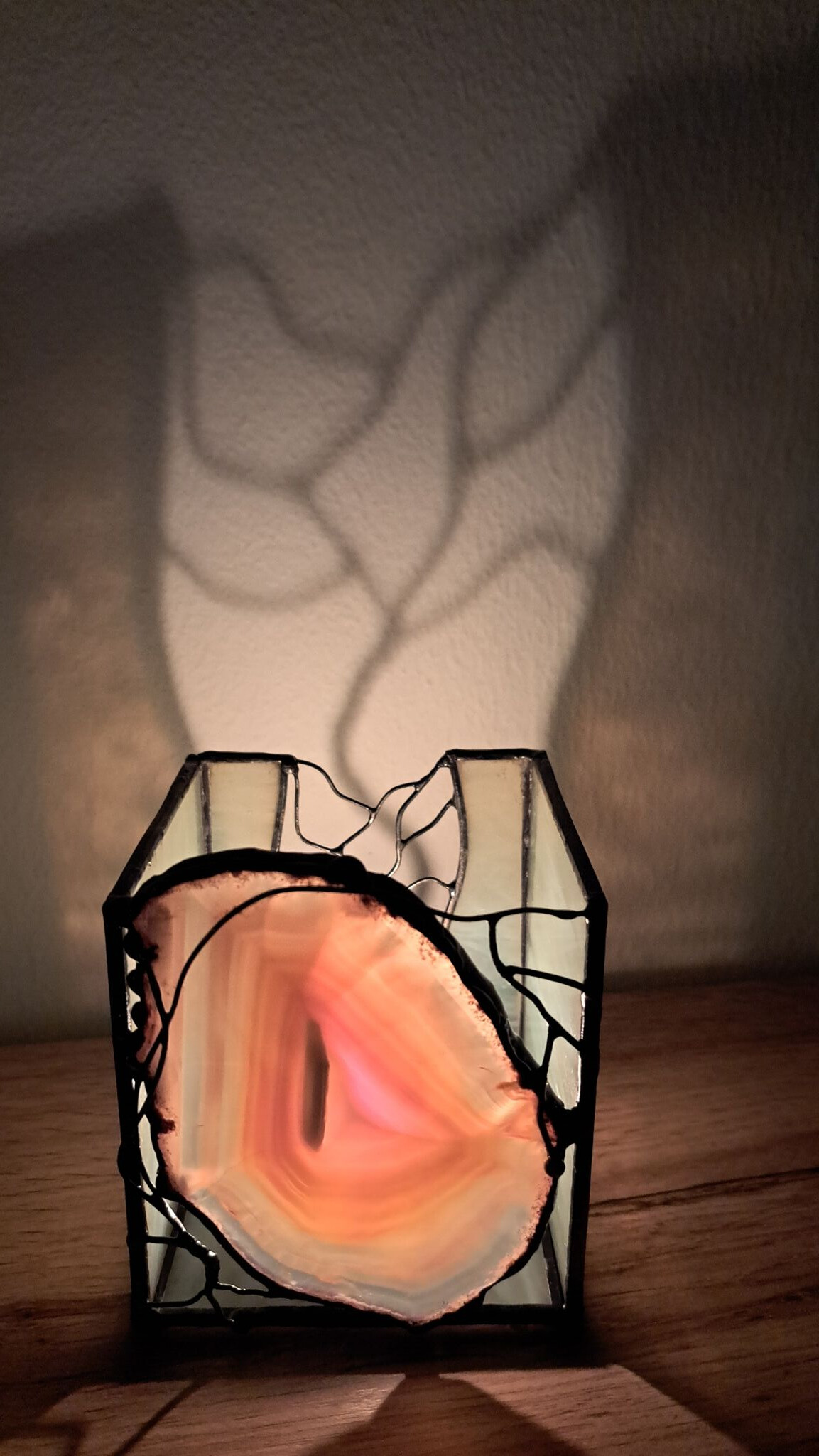 Tento svícen je s velmi jemného odstínu zelenkavé barvy skla, nevíte na pohled zda je to zelenkavá či jemně béžová a to činí tento svícen příjemný na pohled. Motiv stromu a krásně zbarvený přírodní achát dává tomuto kousku originální vzhled a jeho stínohra rozehraje kouzlo večera u svíčky.