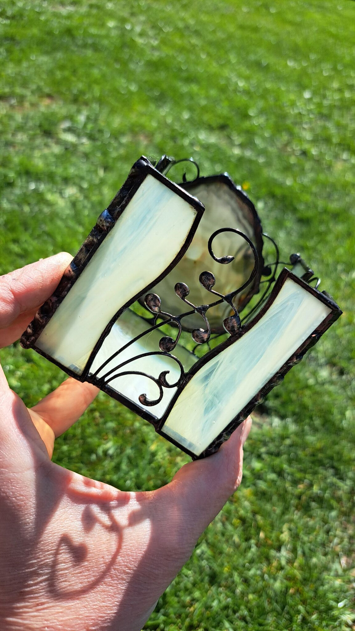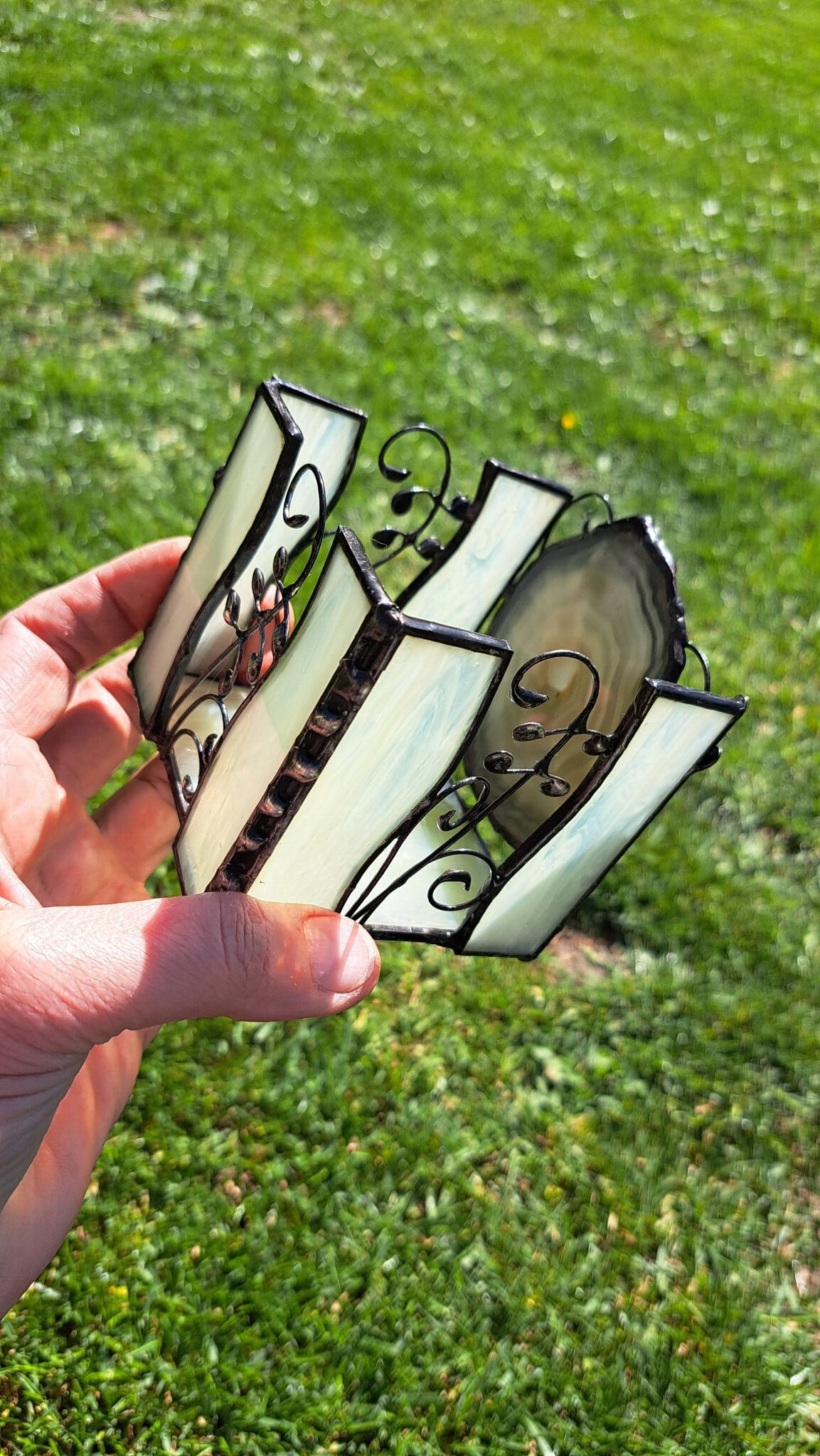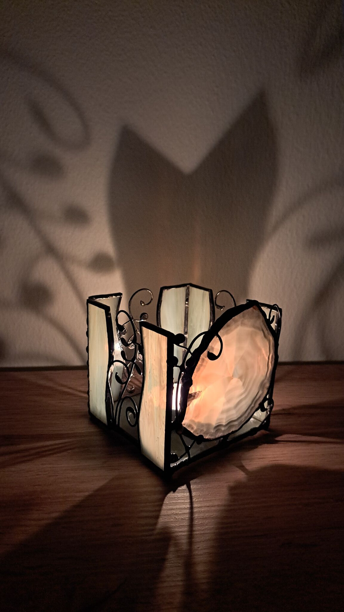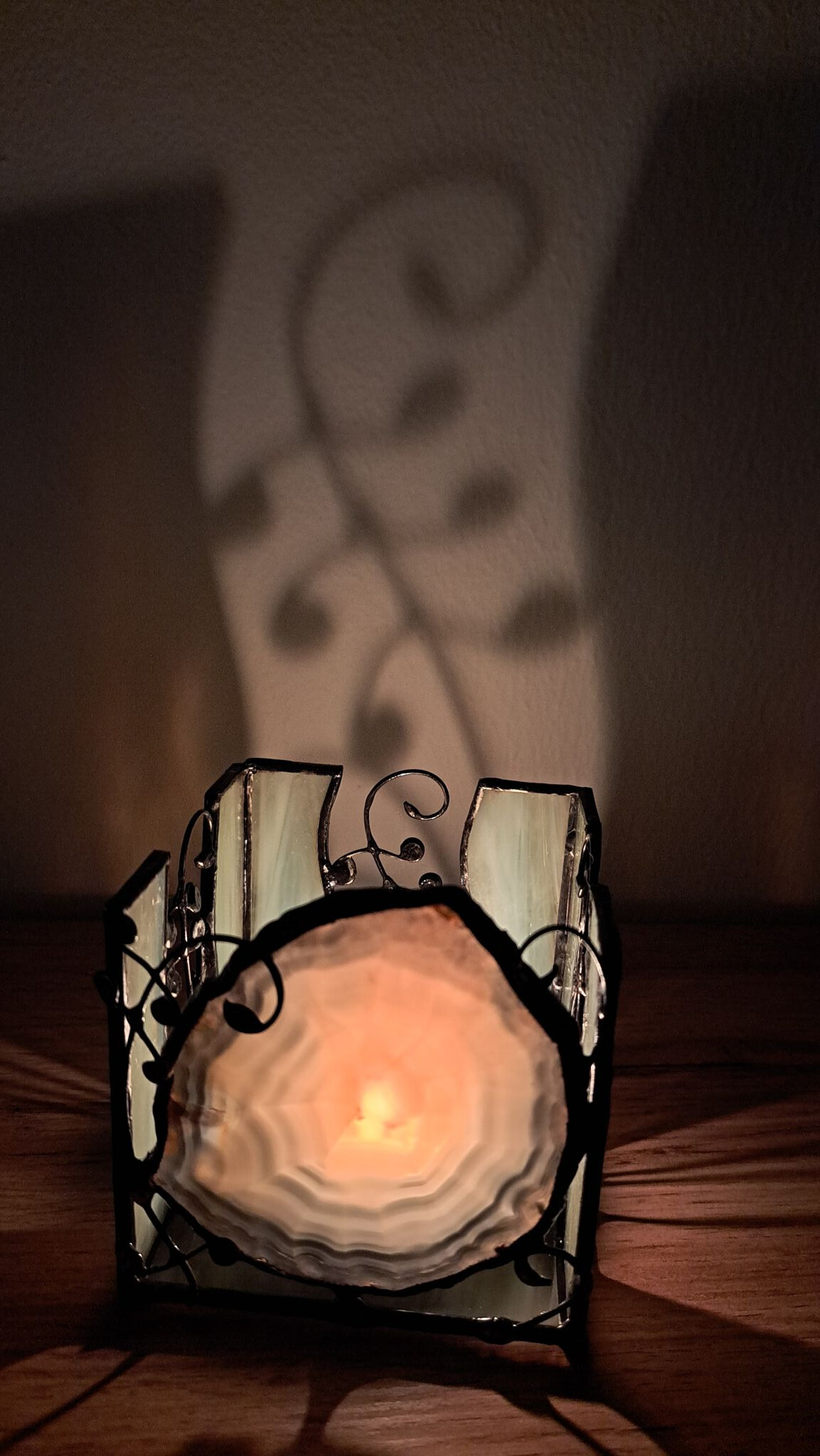 Tento svícen je s velmi jemného odstínu zelenkavé barvy skla, nevíte na pohled zda je to zelenkavá či jemně béžová a to činí tento svícen příjemný na pohled. Rostlinný motiv a krásně zbarvený přírodní achát dává tomuto kousku originální vzhled a jeho stínohra rozehraje kouzlo večera u svíčky.