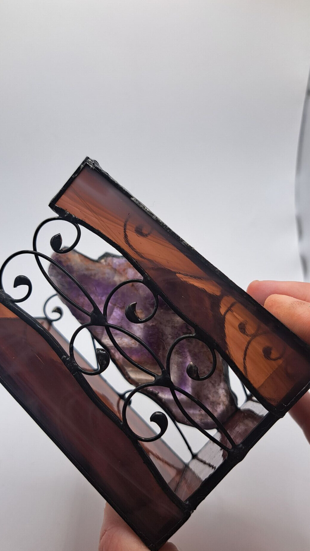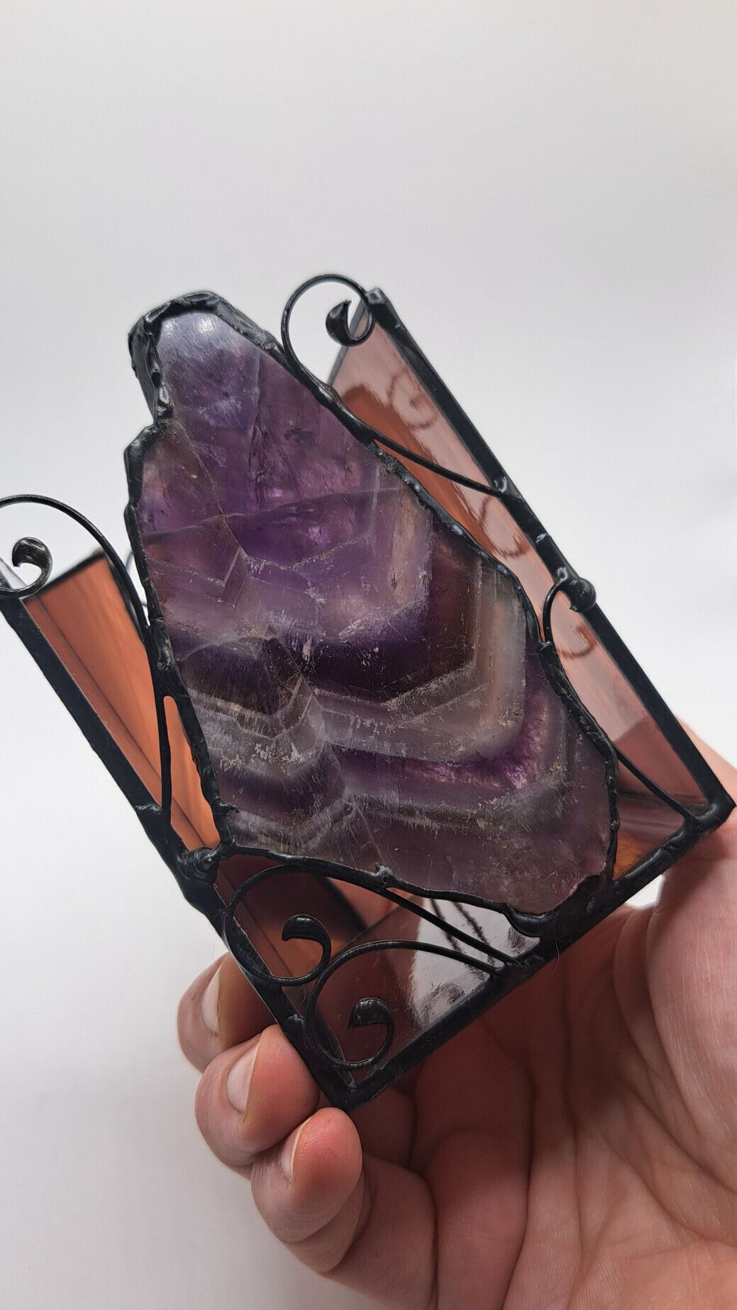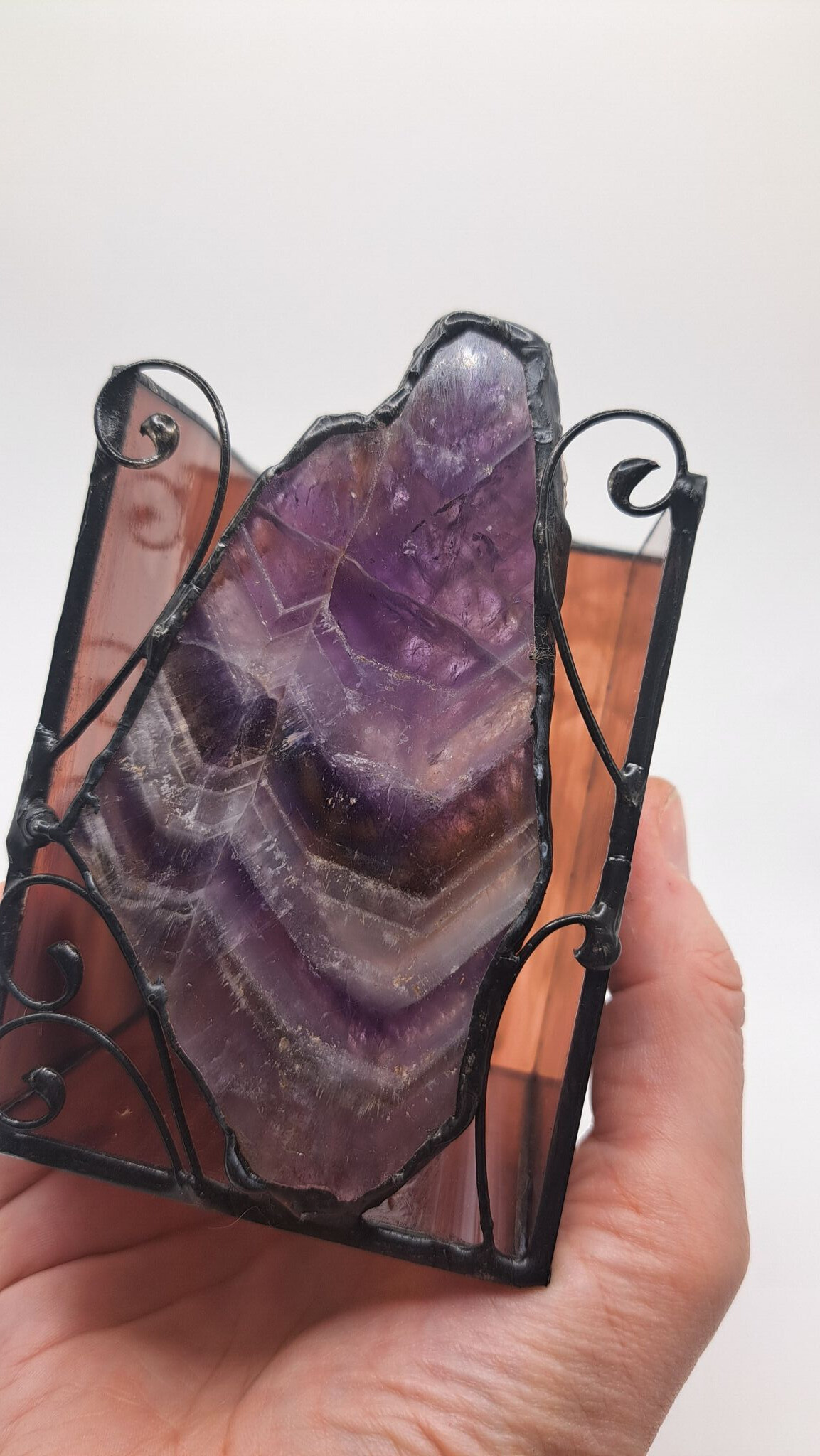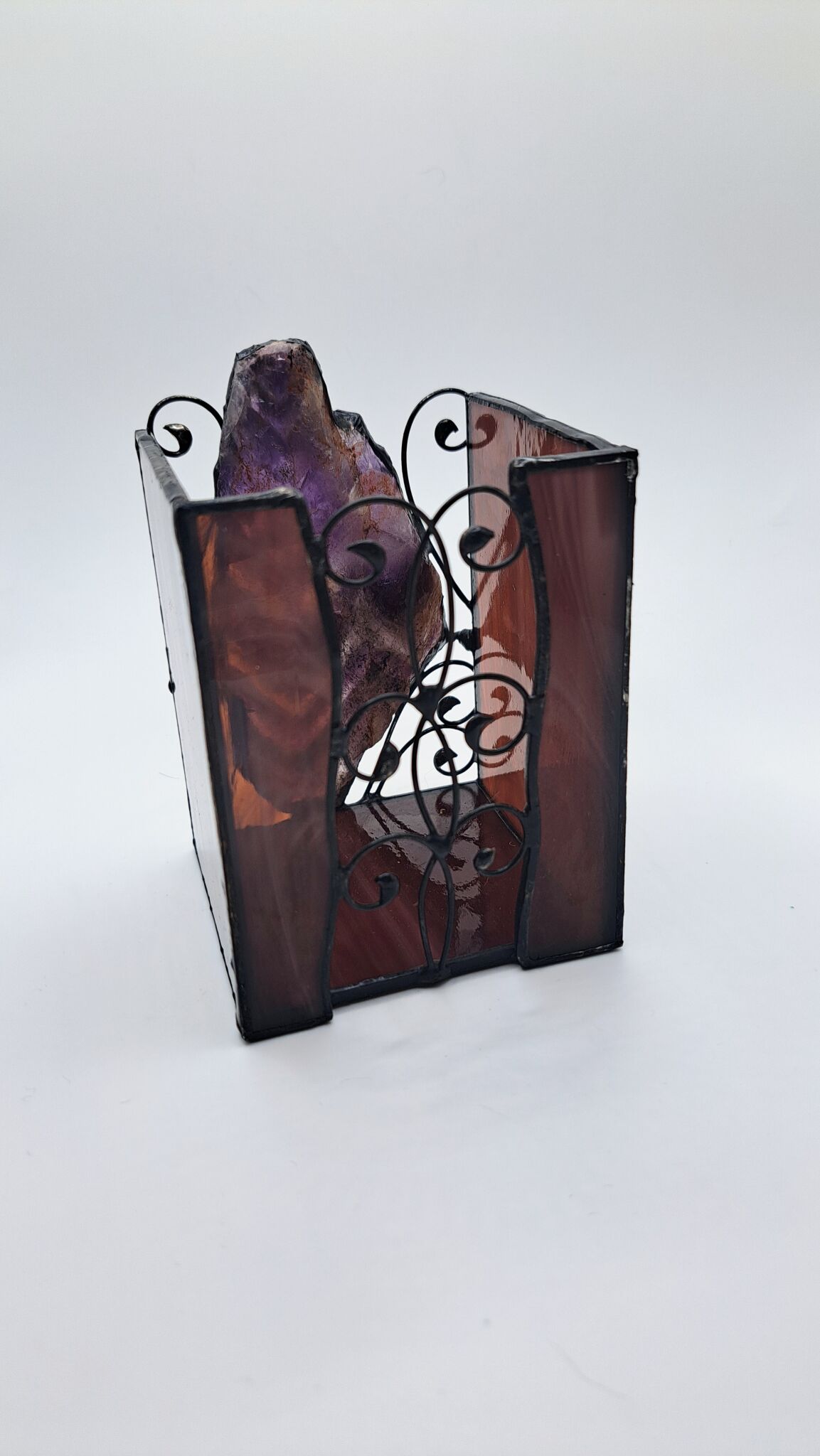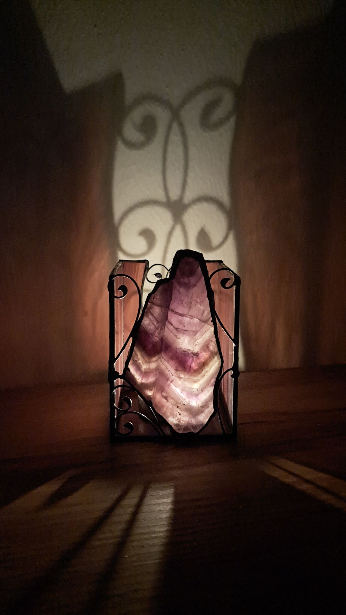 Nádherný leštěný kus ametystu ve svícnu z kouřově fialového skla se stínohrou vám vykouzlí večerní podívanou, stačí jen zapálit čajovou svíčku a postavit svícen blízko zdi .