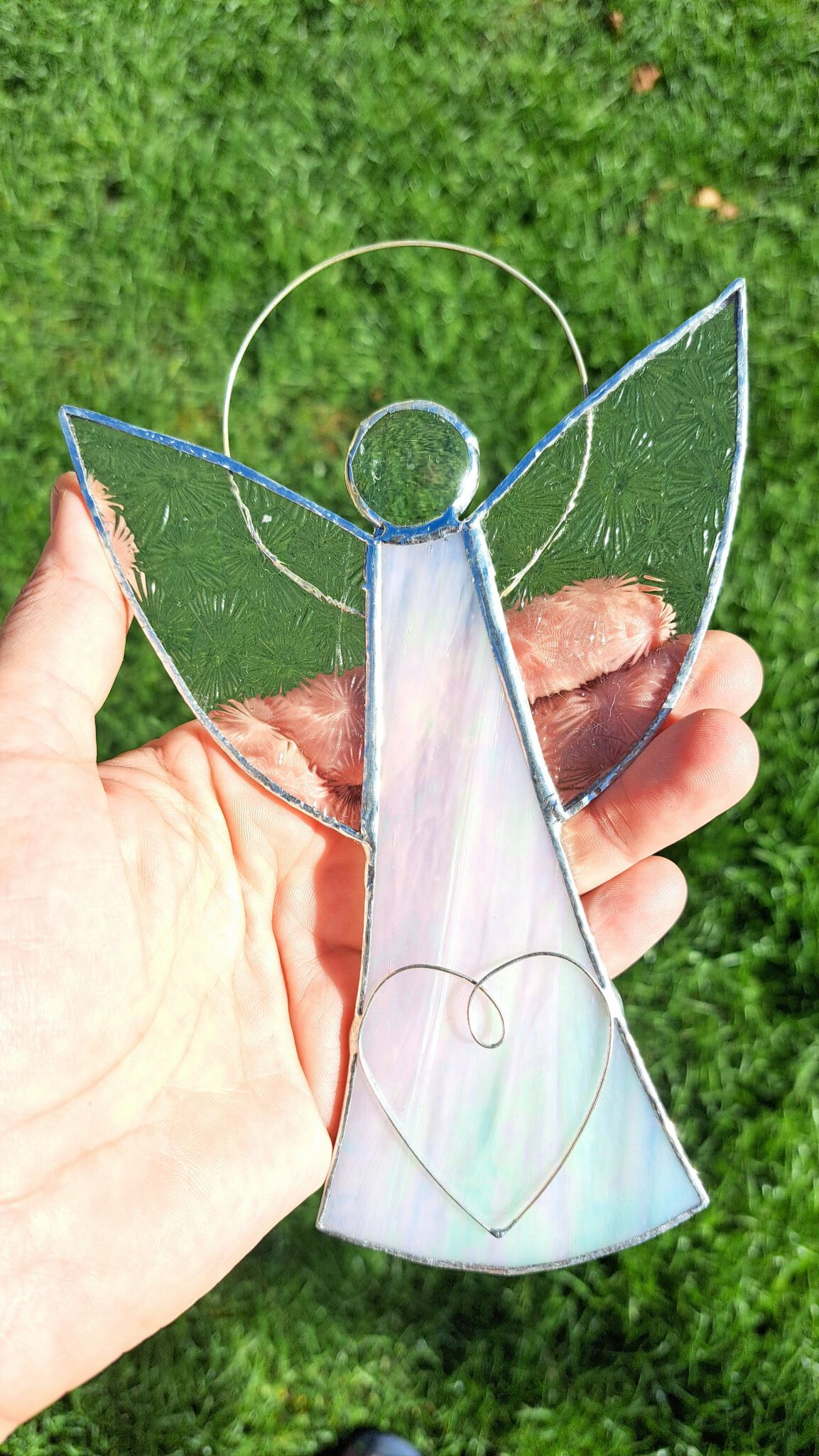 Andílek se srdíčkem Cena 450.00 Kč K odeslání Ihned Skladové číslo 119 Sdílet ks Výrobce: Kybicová Výška: 18 cm Umístění E-shop > Vitrážoví andělé na zavěšení Celková výška i s aurou je cca 18cm, duhové sklo, postříbřený drát, cínováno bezolovnatým cínem.