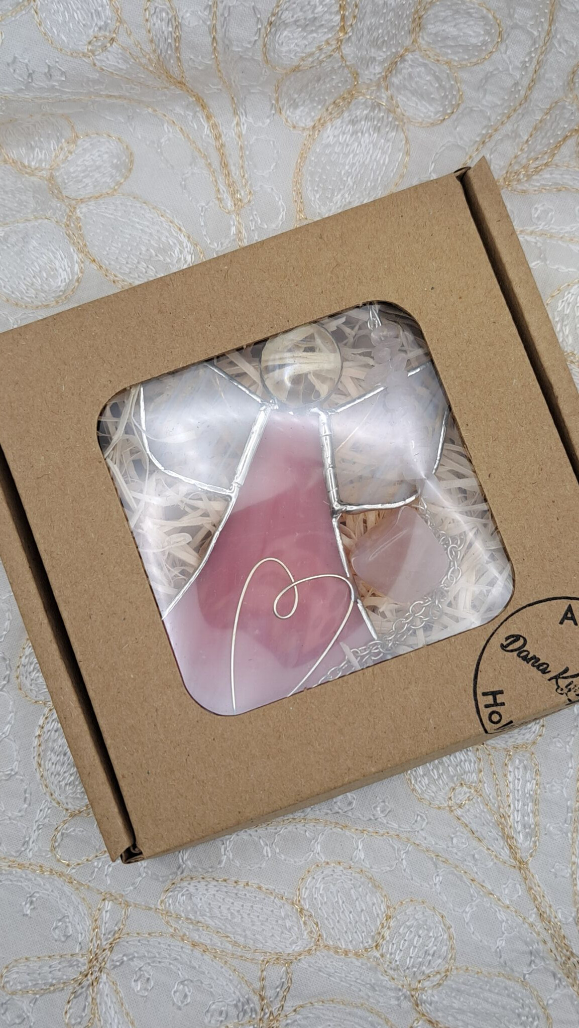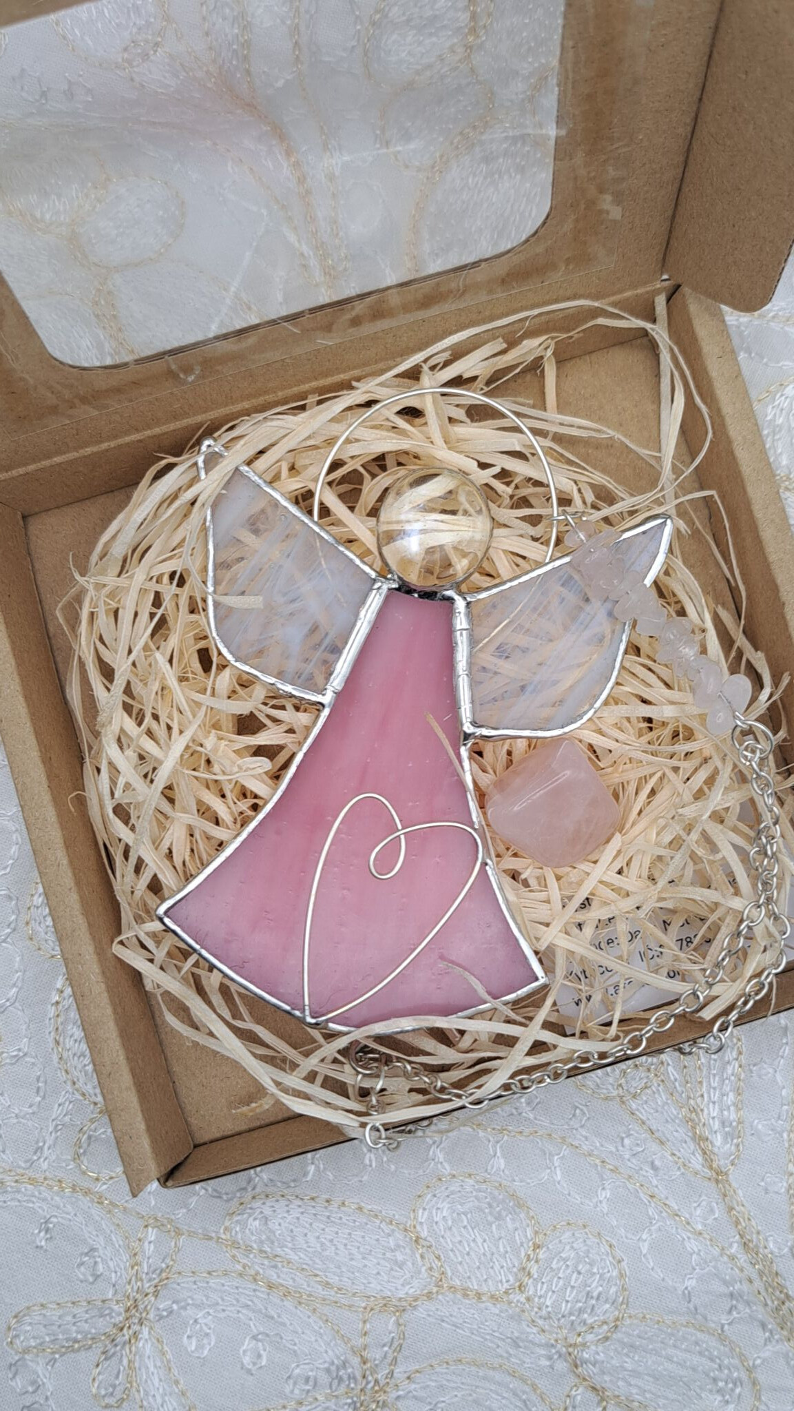 Malá drobnost pro potěšení někomu blízkému. Andílek má ozdobu z růženínů a je zavěšen na bižuterním řetízku cca 20cm se zapínáním. V dárkové krabičce je i malý růženín do kapsy pro štěstí.