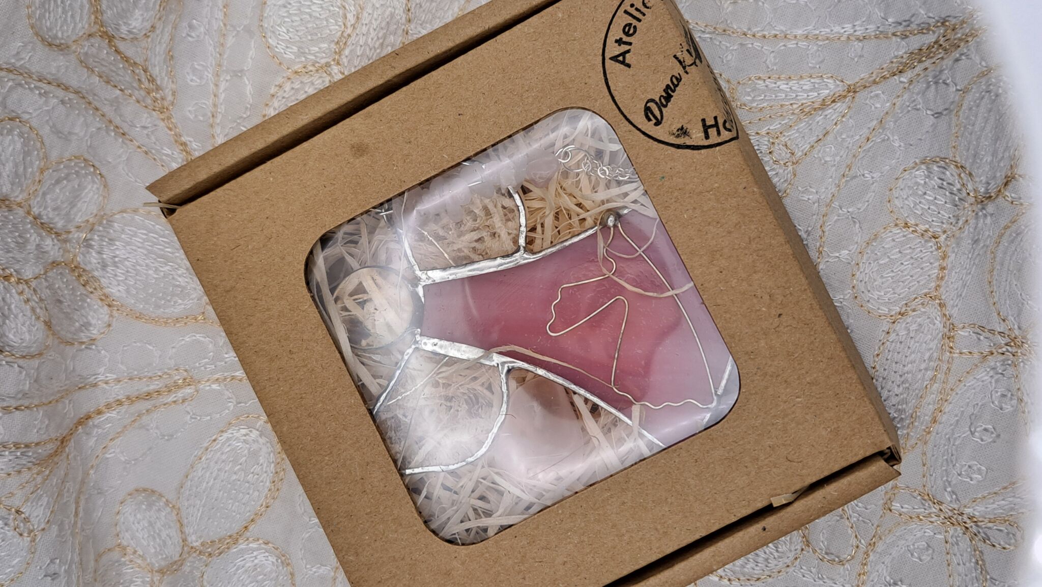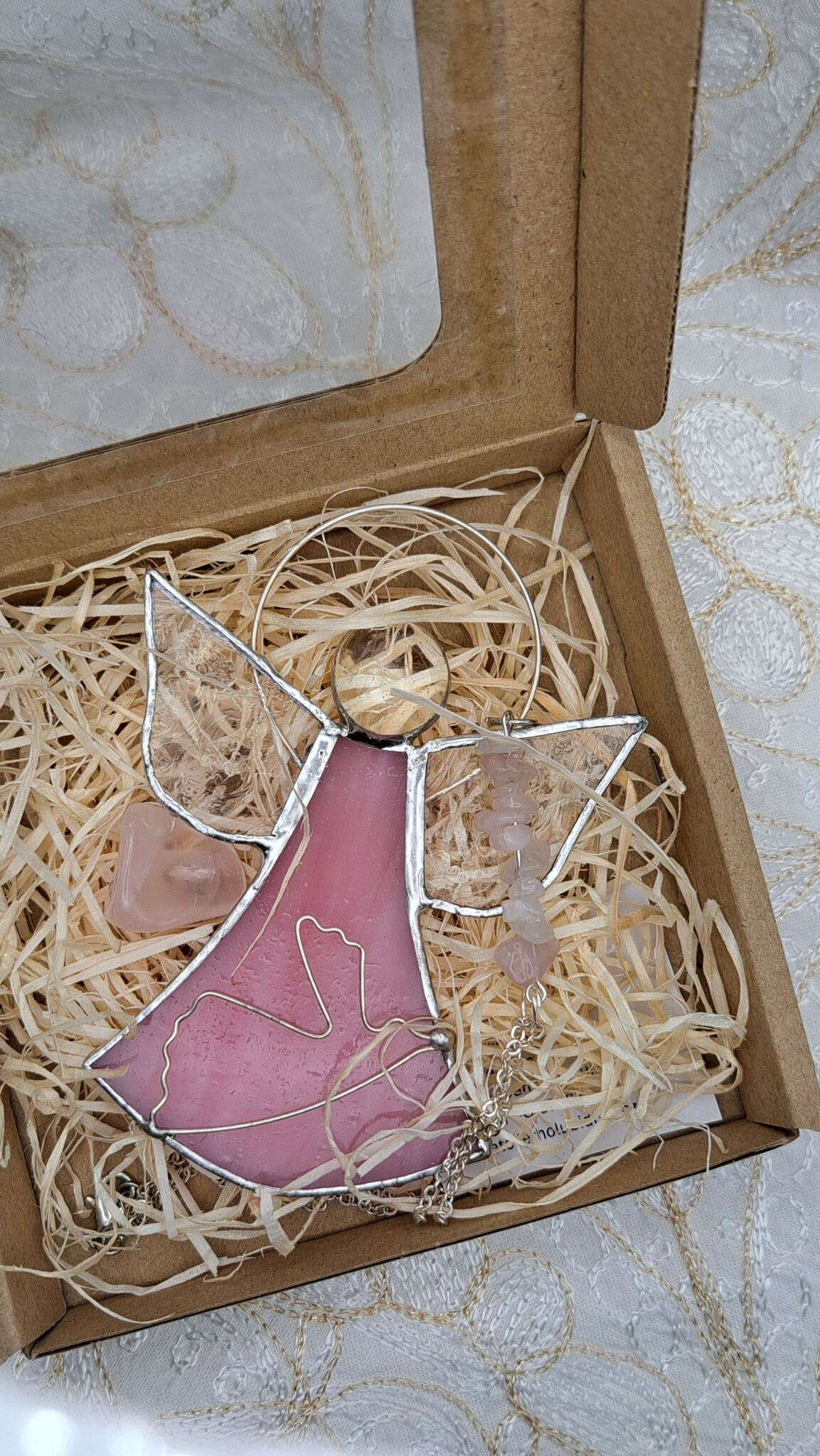 Malá drobnost pro potěšení někomu blízkému. Andílek má ozdobu z růženínů a je zavěšen na bižuterním řetízku cca 20cm se zapínáním. V dárkové krabičce je i malý růženín do kapsy pro štěstí.