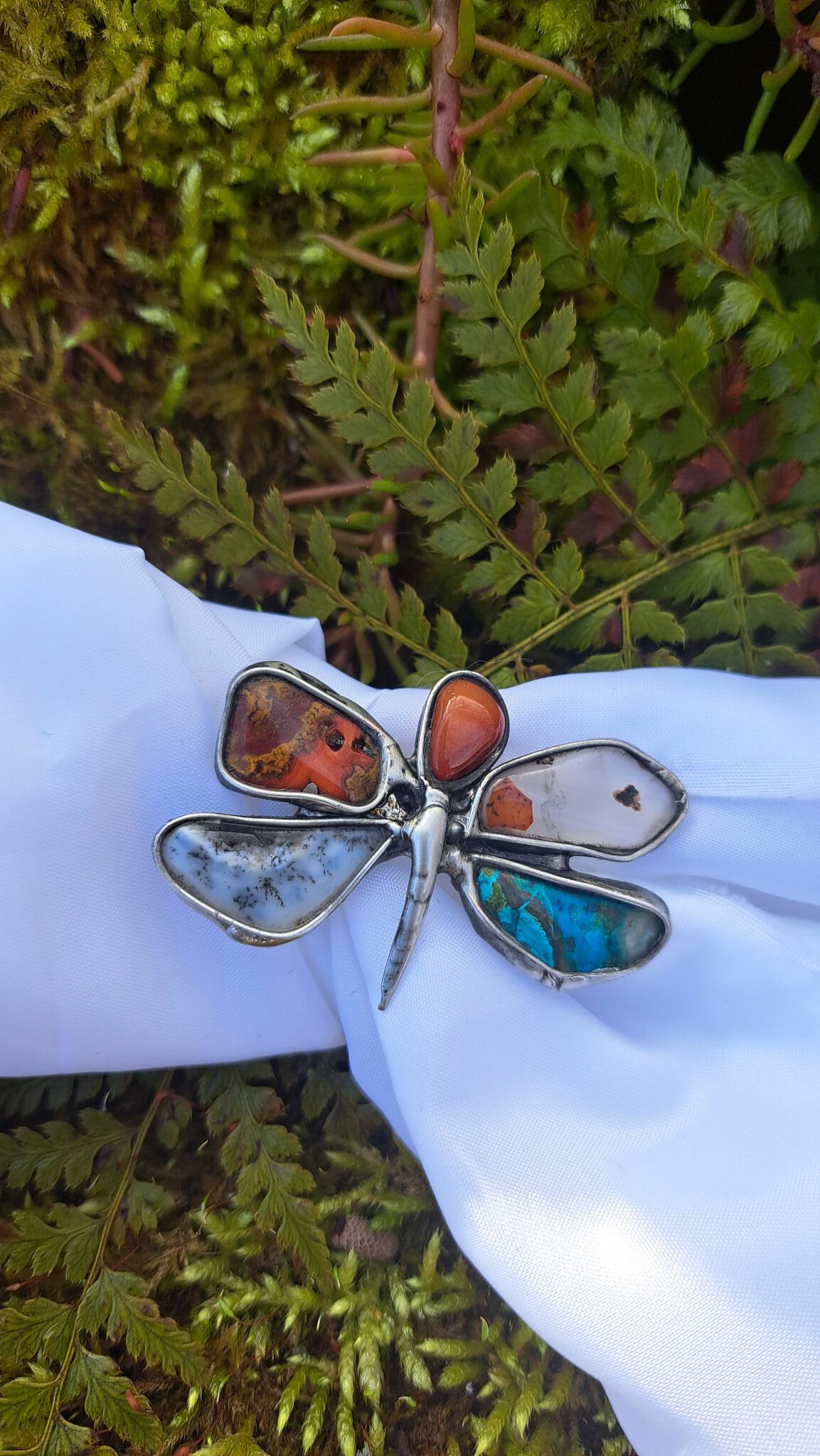 Cínovaná brož z mnoha kamínků, jako je d.opál, achát, karneol, chalcedon.