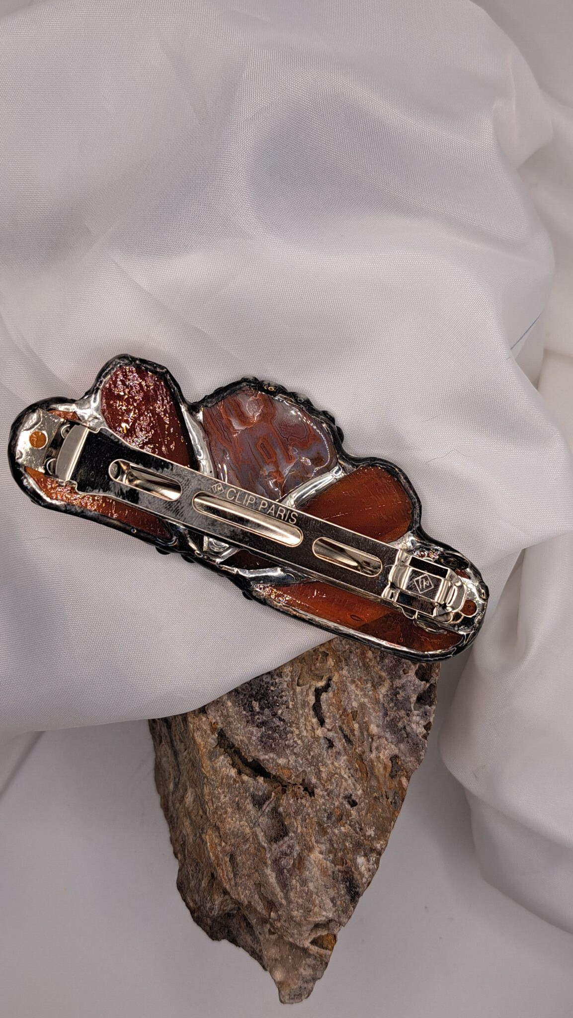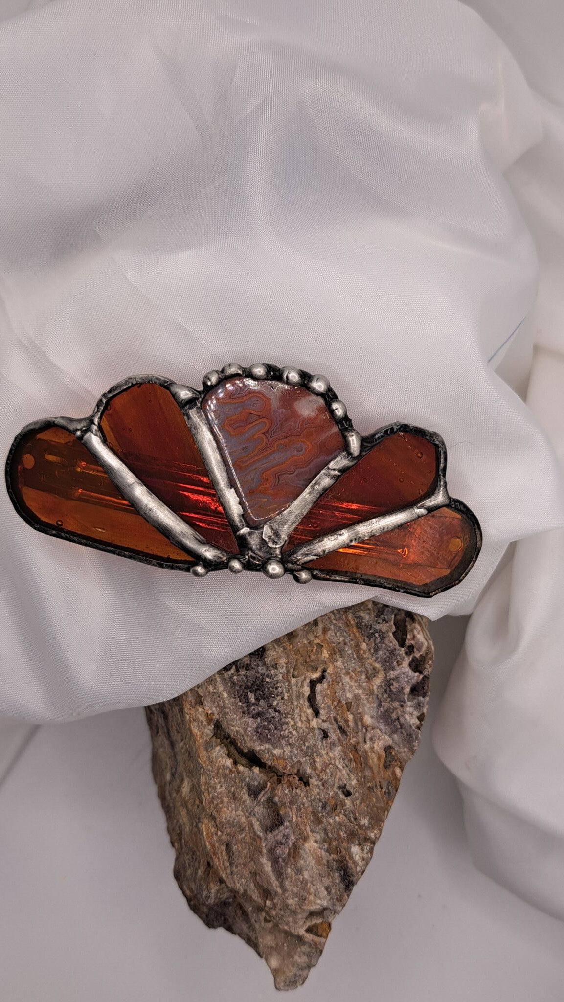 Vlasová sponka je vyrobená ze skla vitrážovou technikou Tiffany na bižuterním základu tzv. francouzská spona. Velikost základu je 10cm. Cínováno šperkařským cínem s obsahem mědi a stříbra. Patinováno černou patinou. Kaminek achát a sklo takové červeno s trochou oranžova i hnědavým odstínem.
