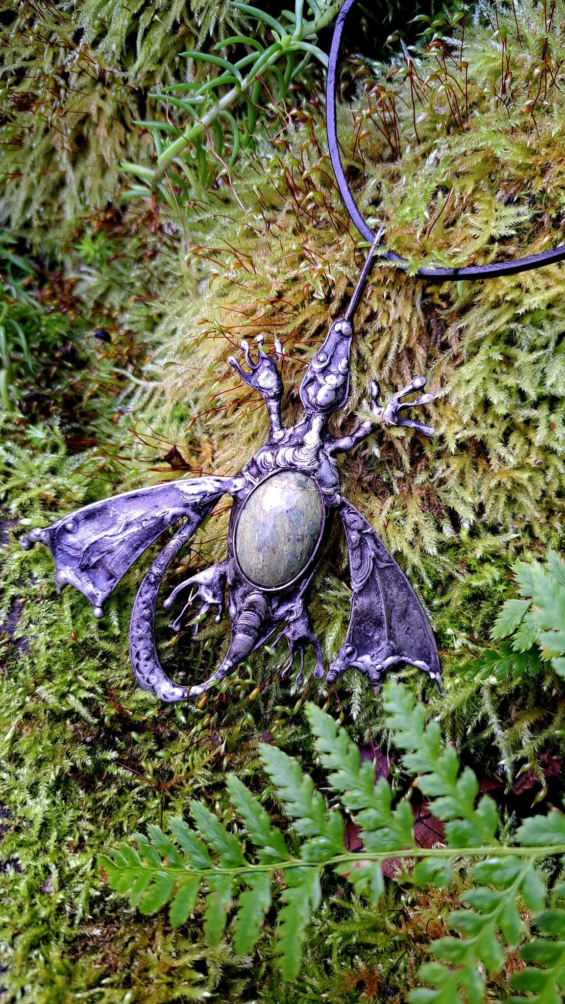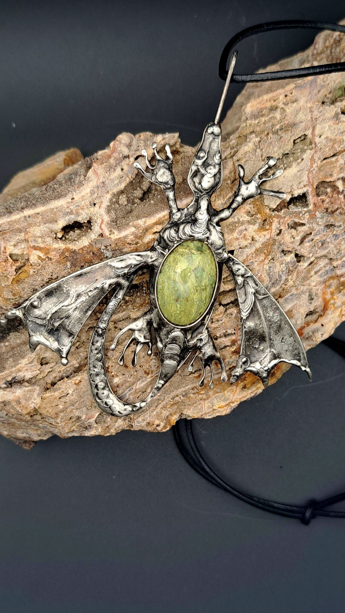 Cínovaný dráček uvnitř se serpentinitem, zavěšeno na kůži.