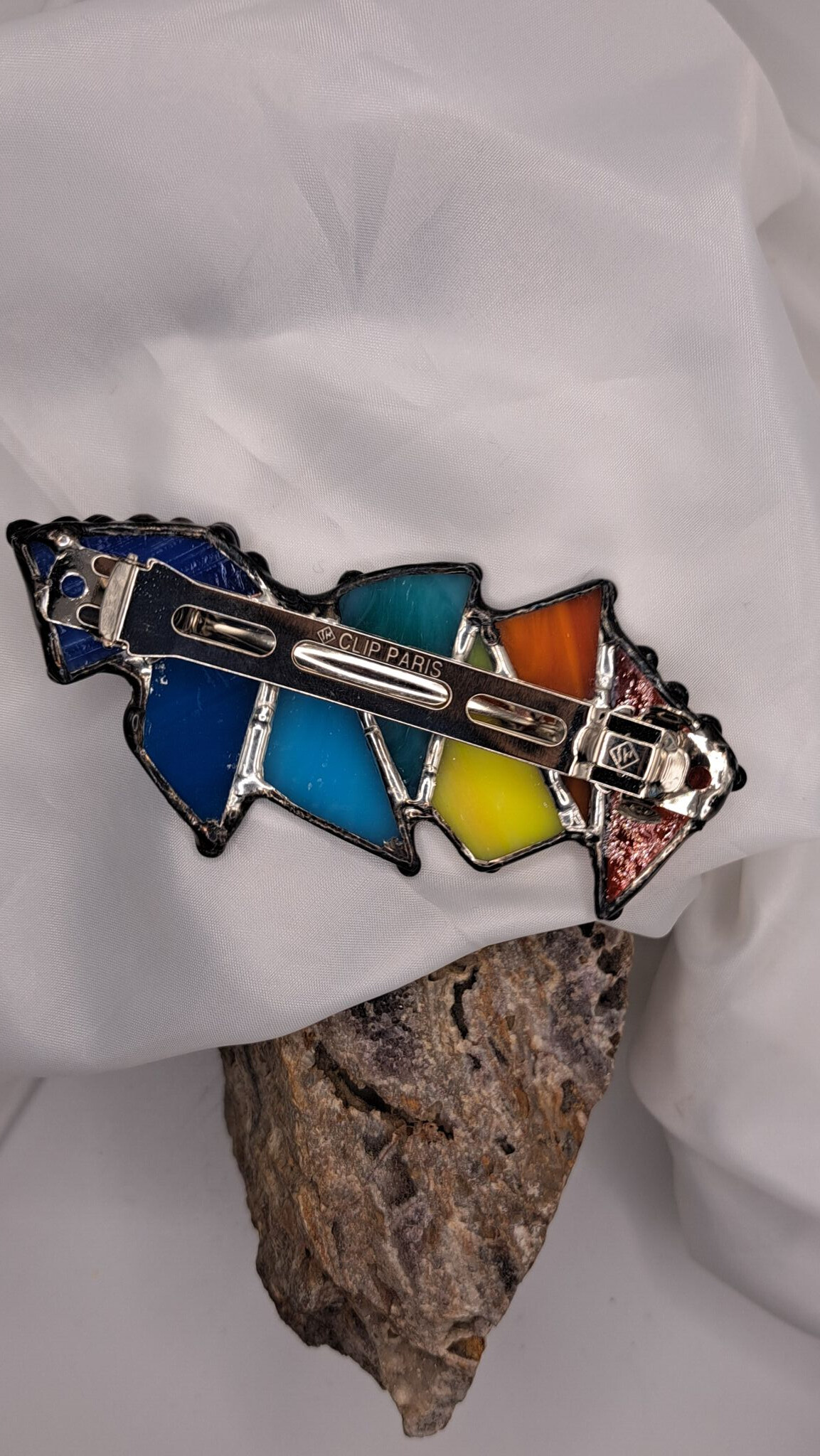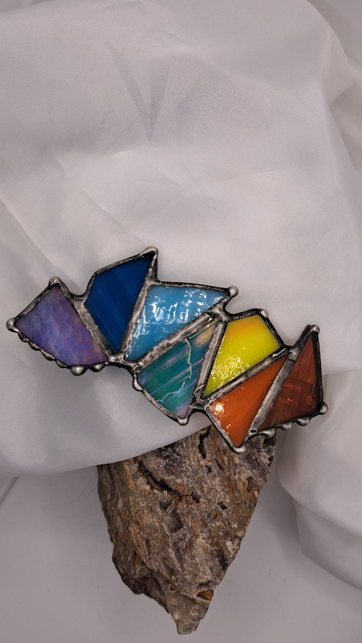 Duhová nebo čakrová, chcete-li, vlasová sponka. Sponka je vyrobená ze skla vitrážovou technikou Tiffany na bižuterním základu tzv. francouzská spona. Velikost základu je 10cm. Cínováno šperkařským cínem s obsahem mědi a stříbra. Patinováno černou patinou.