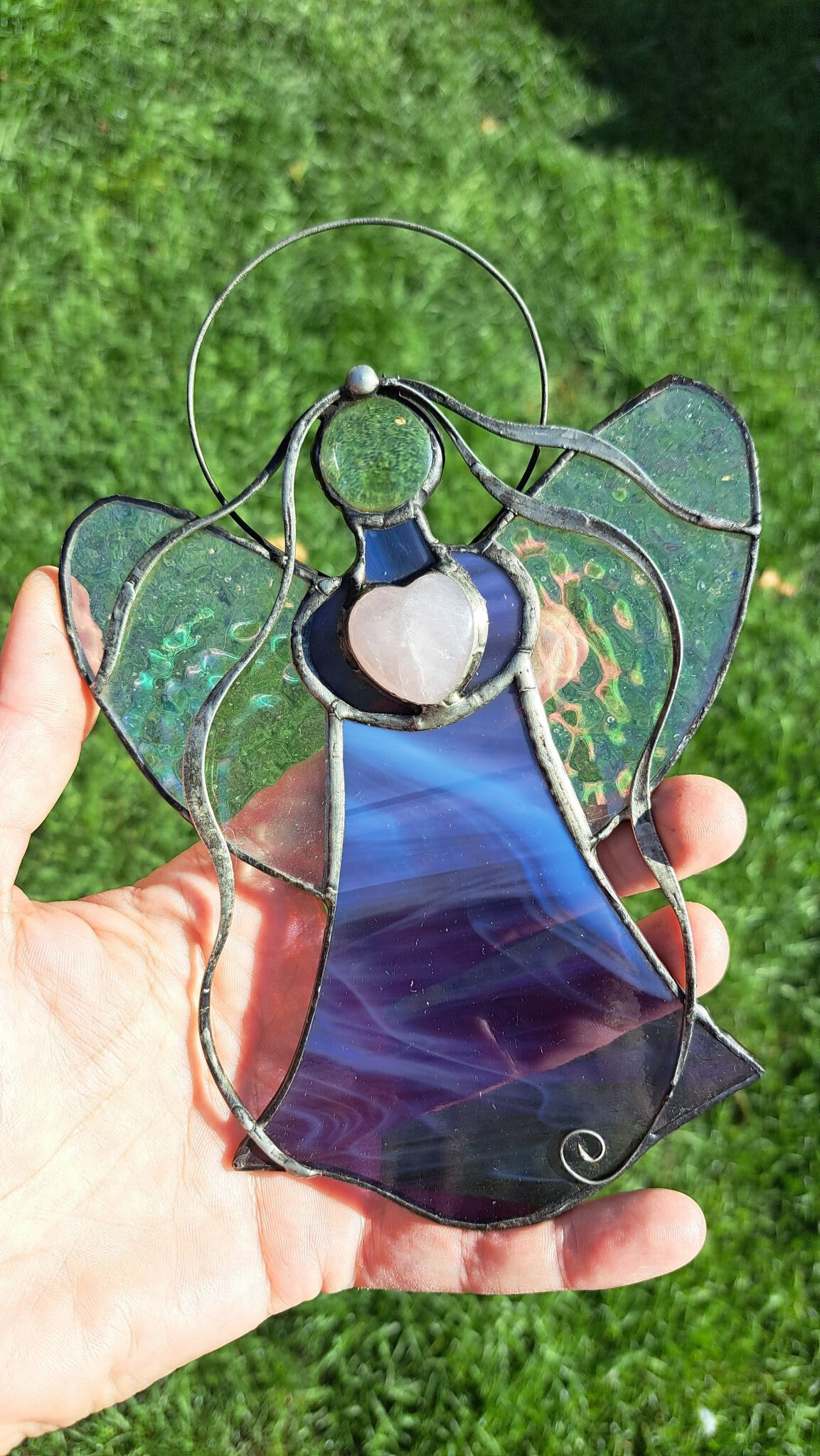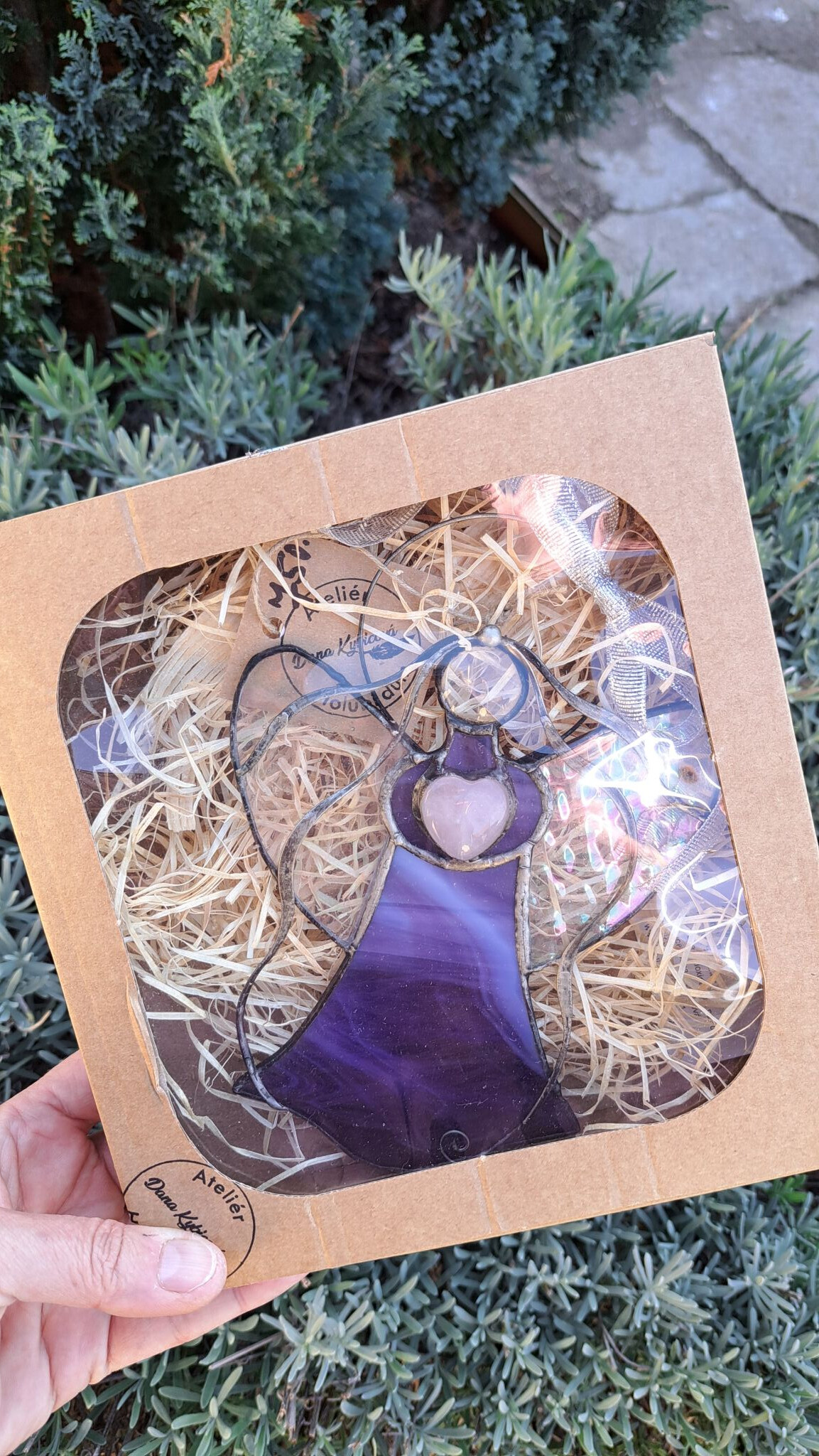 Celková výška i s aurou je cca 18cm, fialové sklo sklo, růženín, cínováno bezolovnatým cínem, patina. Dárková krabička v ceně.