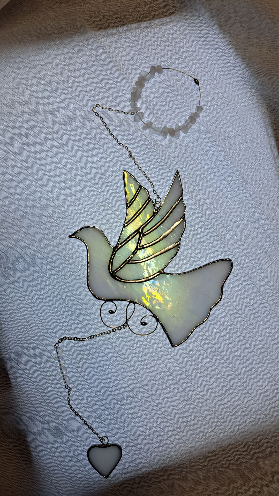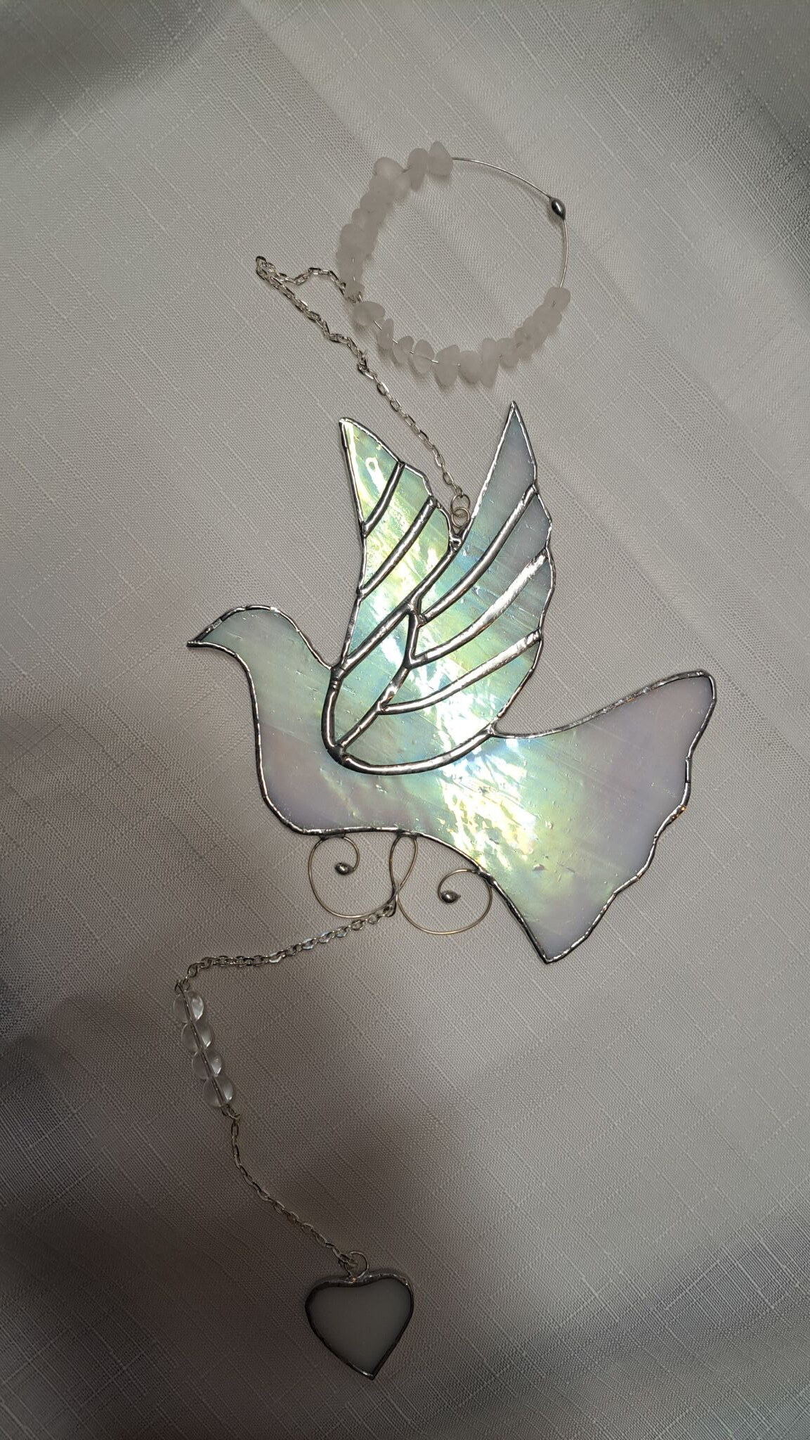Bílá něžná holubička do romantického okna. Holoubci jsou mojí nekonečnou inspirací, vidím na ně z ateliéru a kousek toho pohledu je tu zde ze skla.