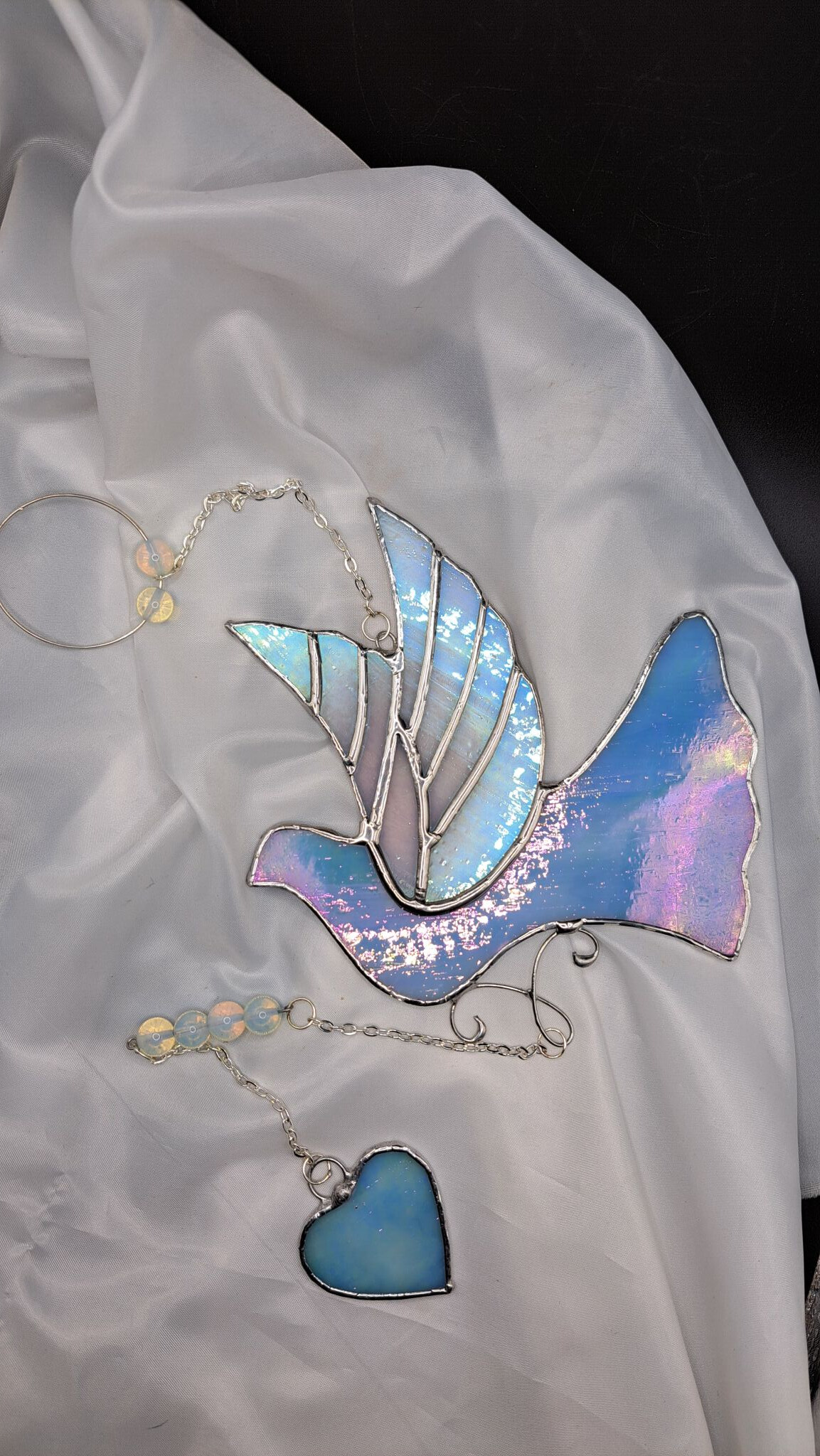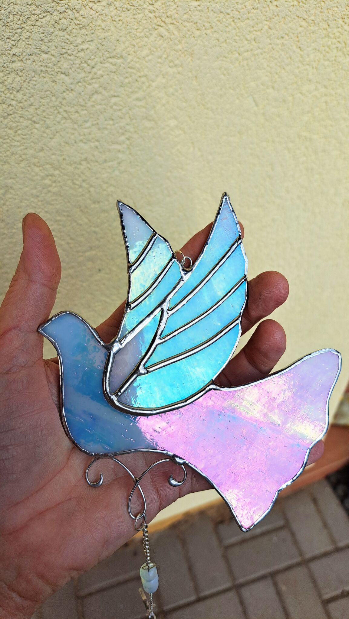 Něžná holubička do romantického okna. Holoubci jsou mojí nekonečnou inspirací, vidím na ně z ateliéru a kousek toho pohledu je tu zde ze skla. Irizující sklo, měňavé barvy,