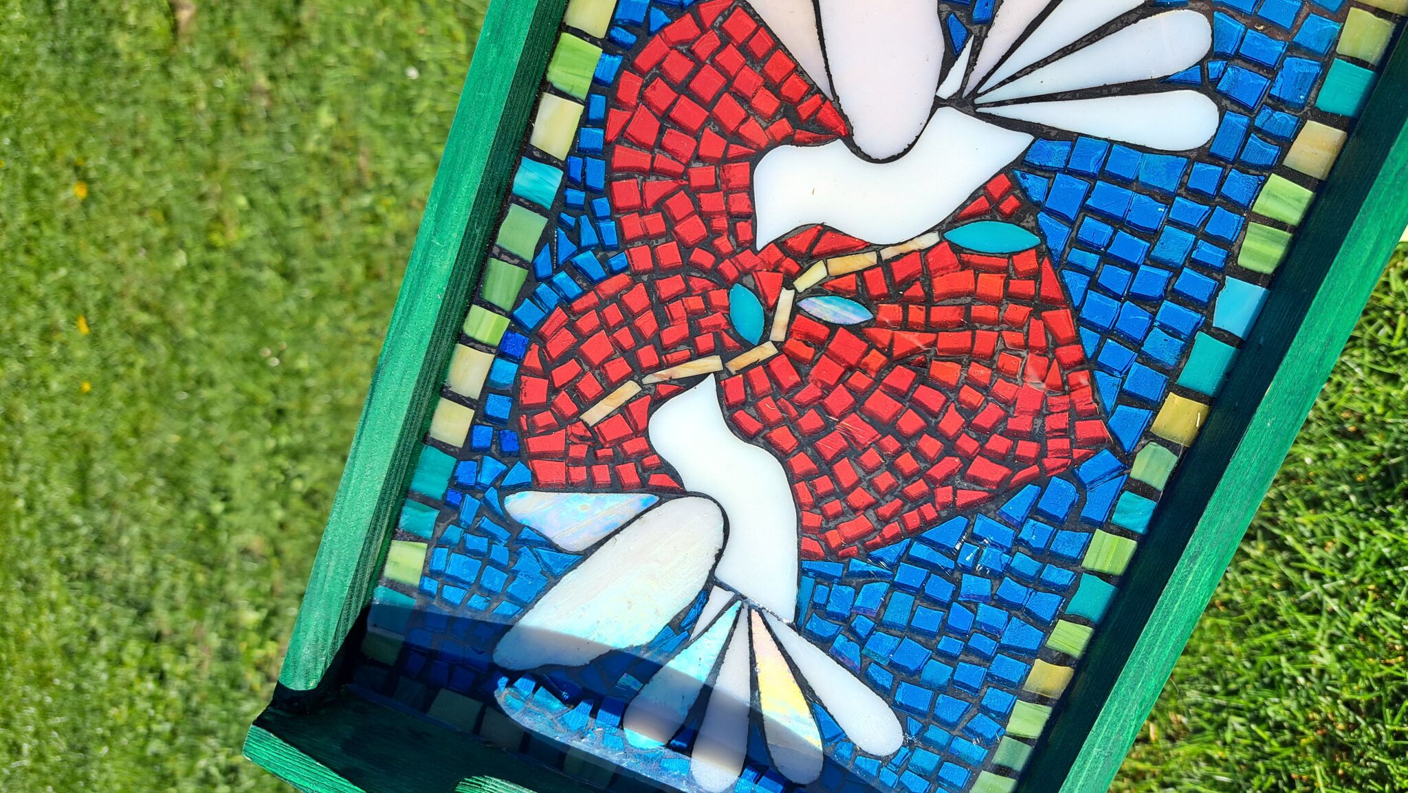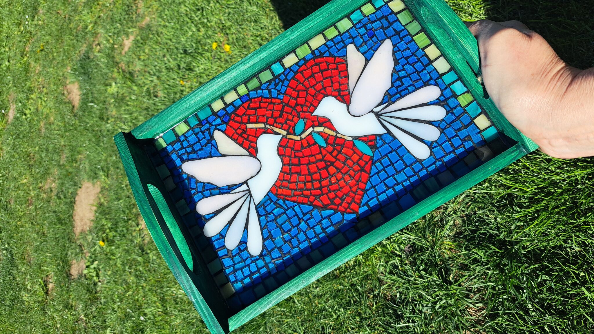 Originální dřevěný podnos se skleněnou mozaikou zalitou křišťálovou pryskyřicí.