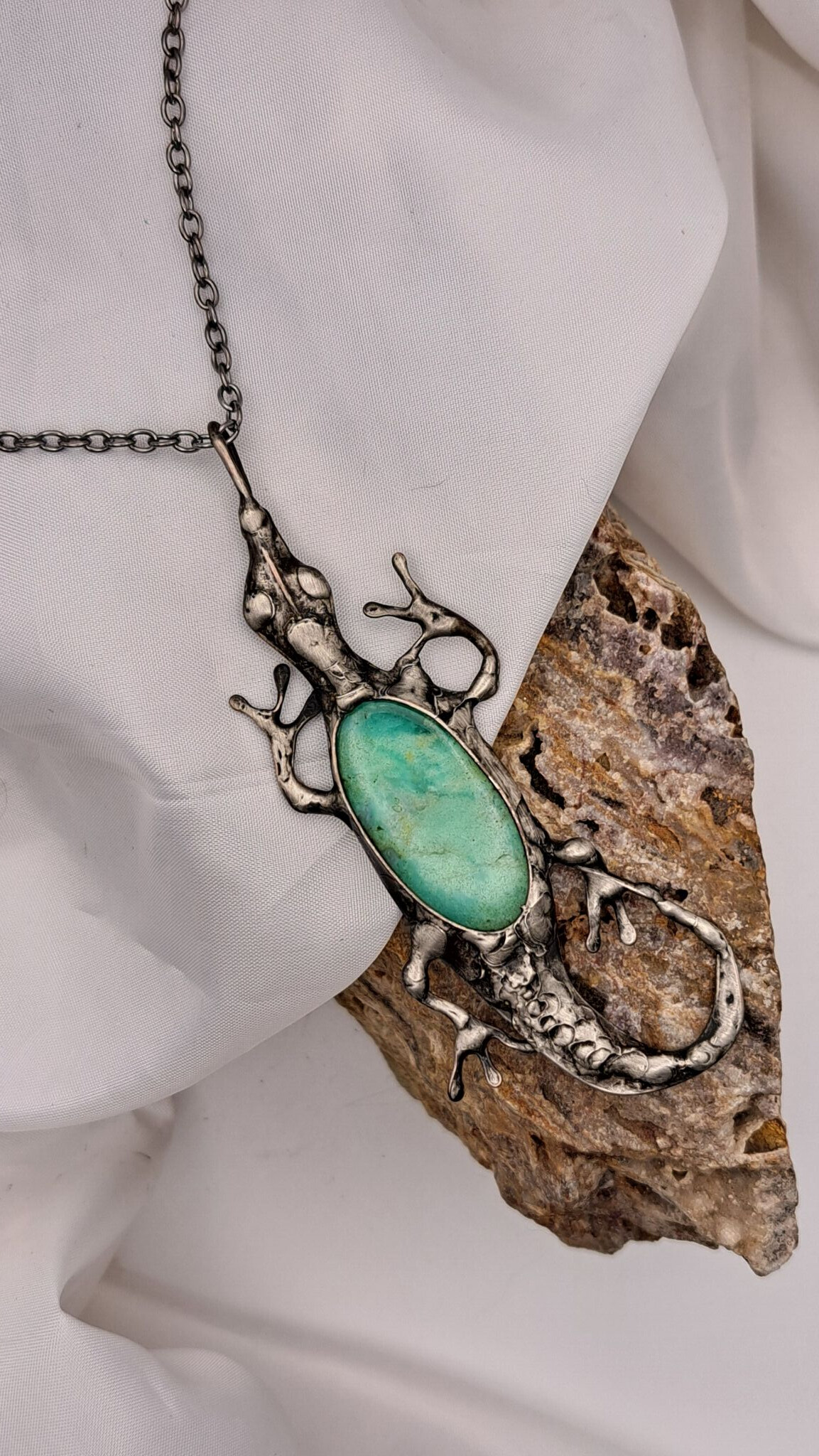 Ještěrka Cena 820.00 Kč Skladem 1 ks K odeslání Ihned Skladové číslo 42 Sdílet ks Výrobce: Kybicová Výška: 9 cm Umístění E-shop > Cínované šperky Ještěrka, která nikam neuteče. Kamínek amazonit. Cínováno šperkařským cínem .
