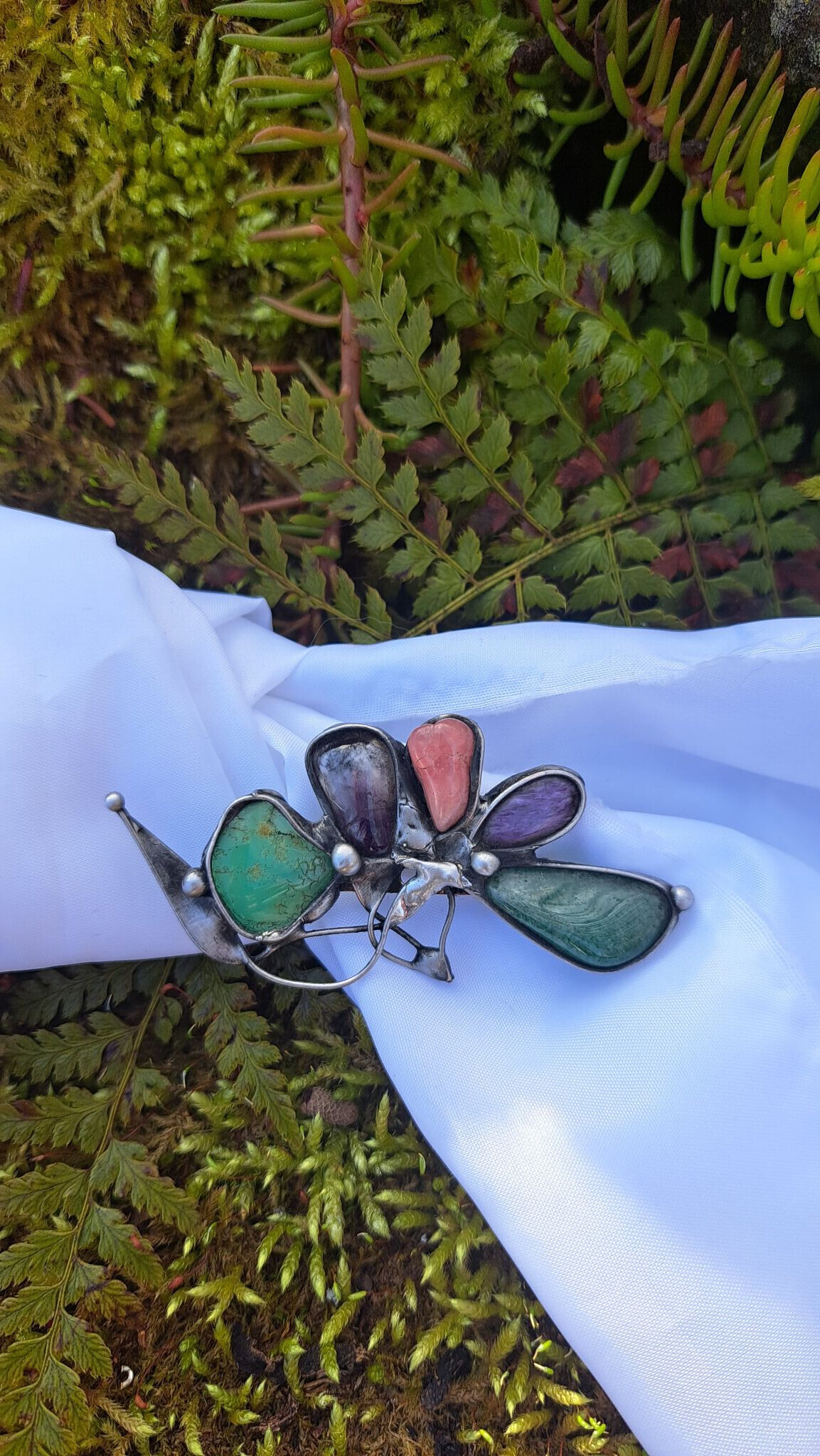 Cínovaná ručně vyrobená kamínková brož na bižuterním můstku. Kamínky jsou avanturín, ametyst, čaroit a rodonit.