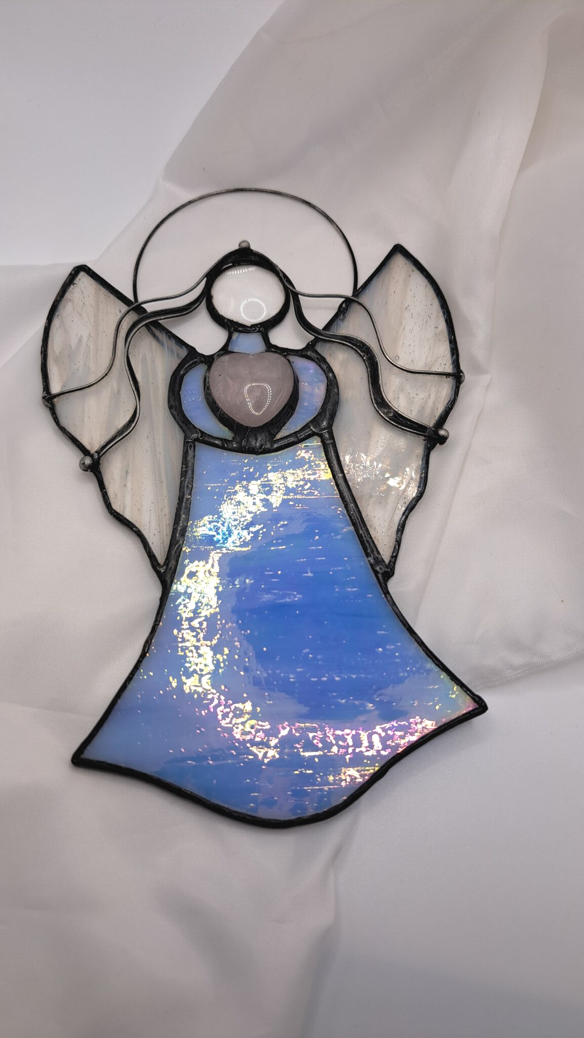 Originální andílek z duhovým sklem , které působí jako modré, ale zároveň vidíte fialovou a další duhové barvy. Pokud chcete malého anděla na zavěšení, může být tento s růženínovým srdcem tou pravou volbou. Sklo není průhledné(křídla ano) a tak může viset i na zdi.