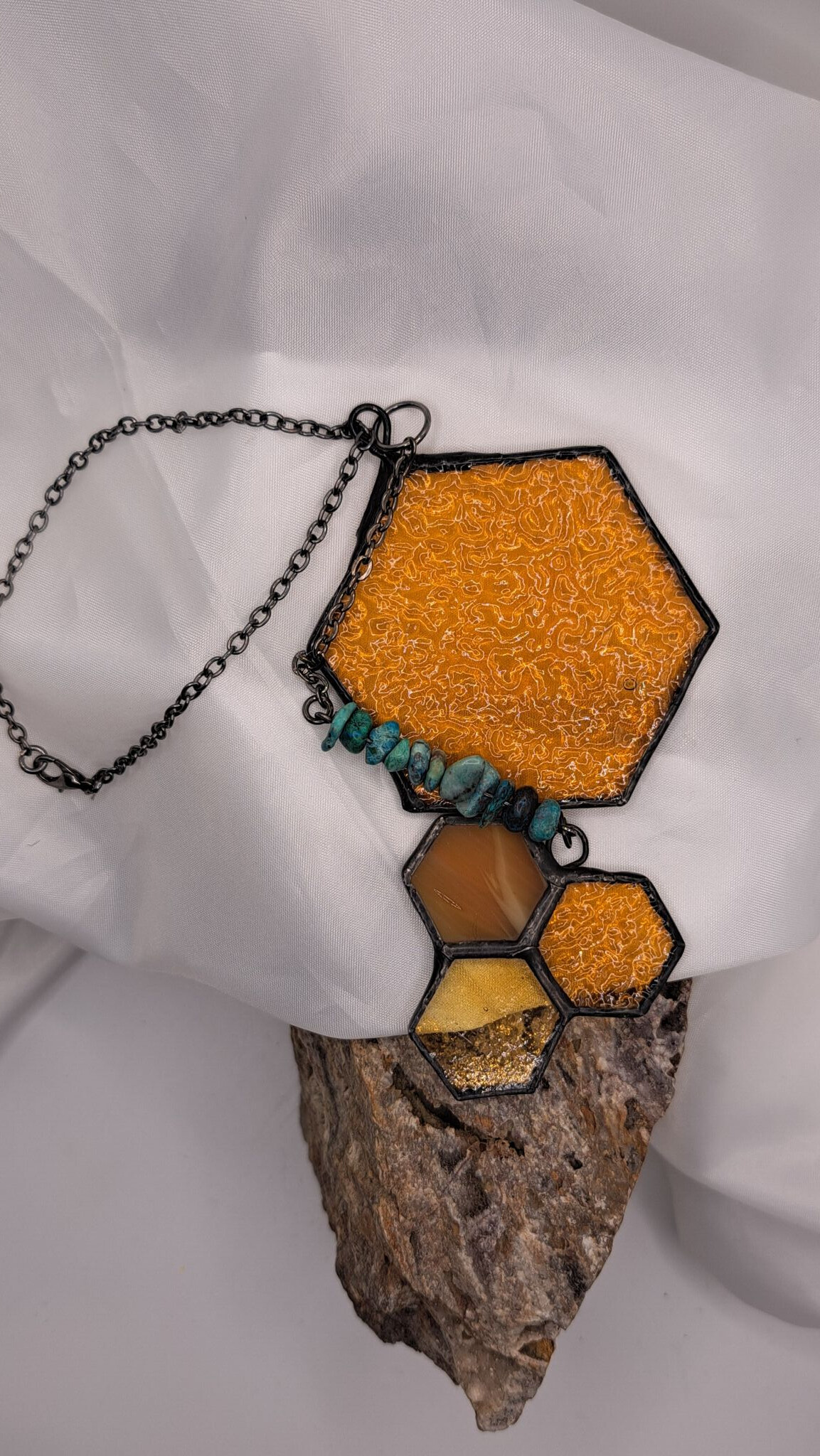 Včelí téma jako malá prkotinka, dvě plástve 5+4cm spojené řetízkem 20cm s malou ozdůbkou z chryzokolu a k tomu kamínek chryzokol jako dárek a to celé v dárkové krabičce.