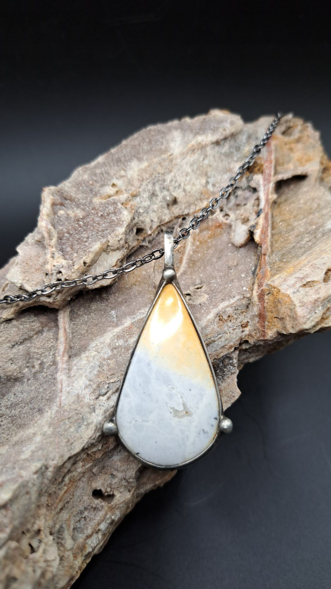 Cínováno šperkařským cínem, patinováno a přívěsek je zavěšen na cca 60cm bižuterním řetízku.