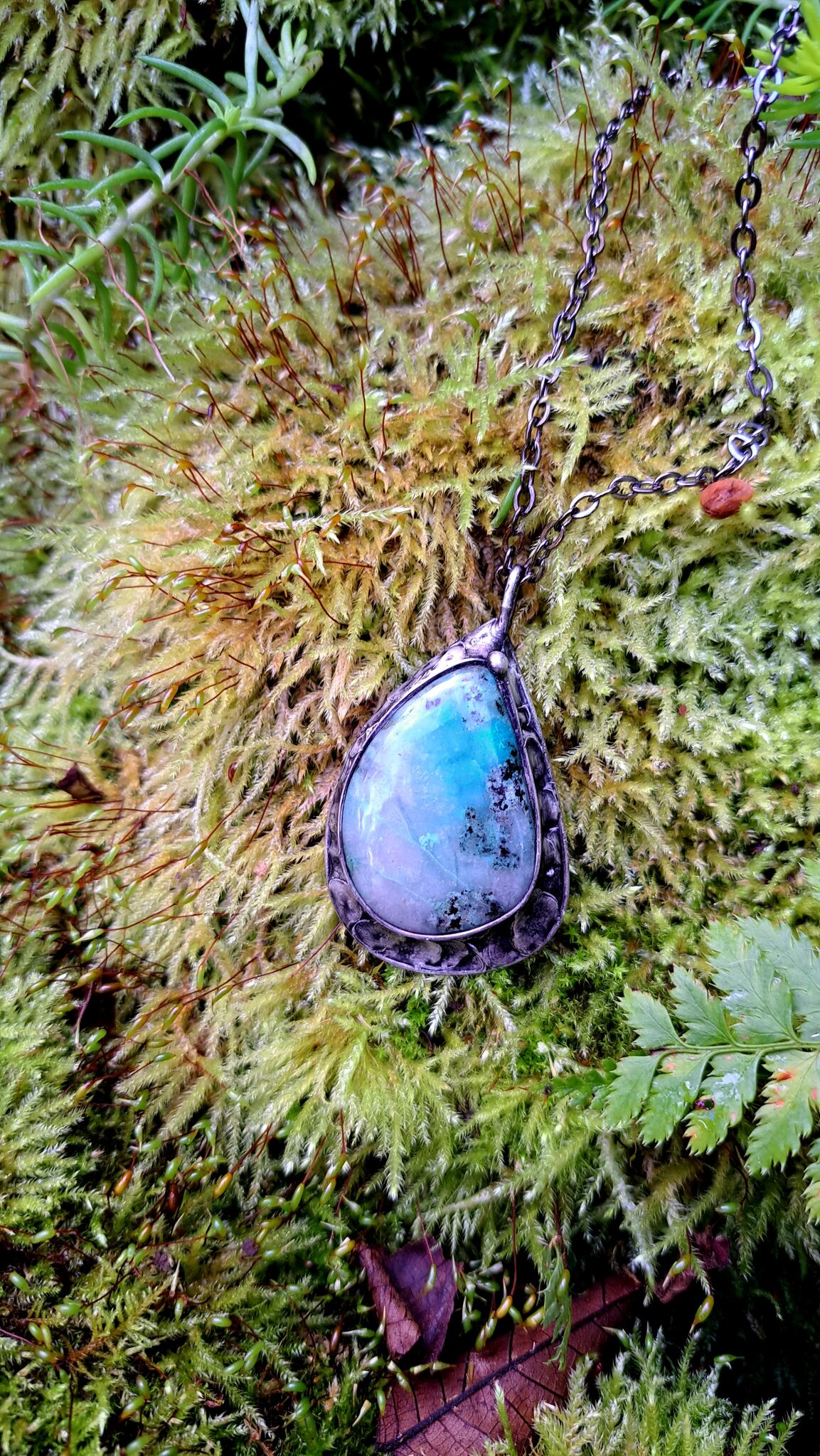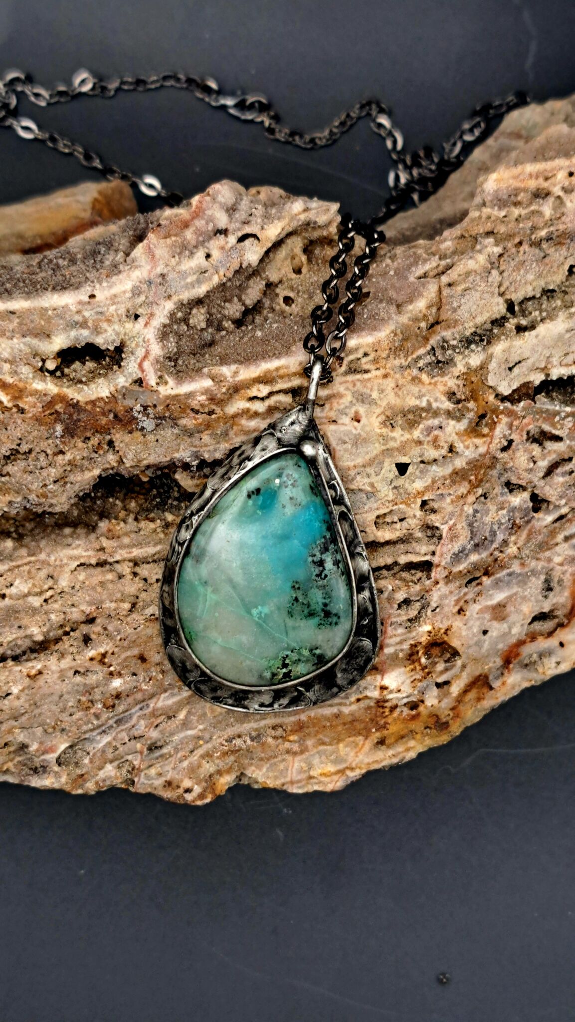Kamínek v uklidňujících modrozelených odstínech, cínováno bezolovnatým šperkařským cínem a patinováno. Zavěšen na tmavém řetízku 60cm.