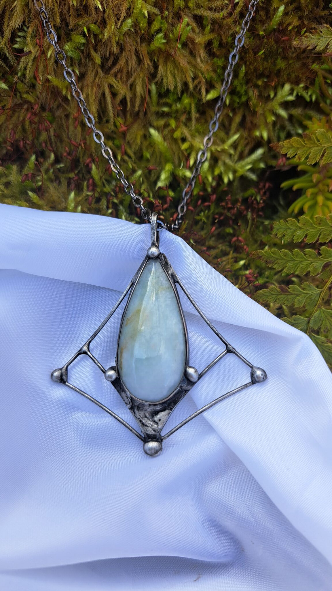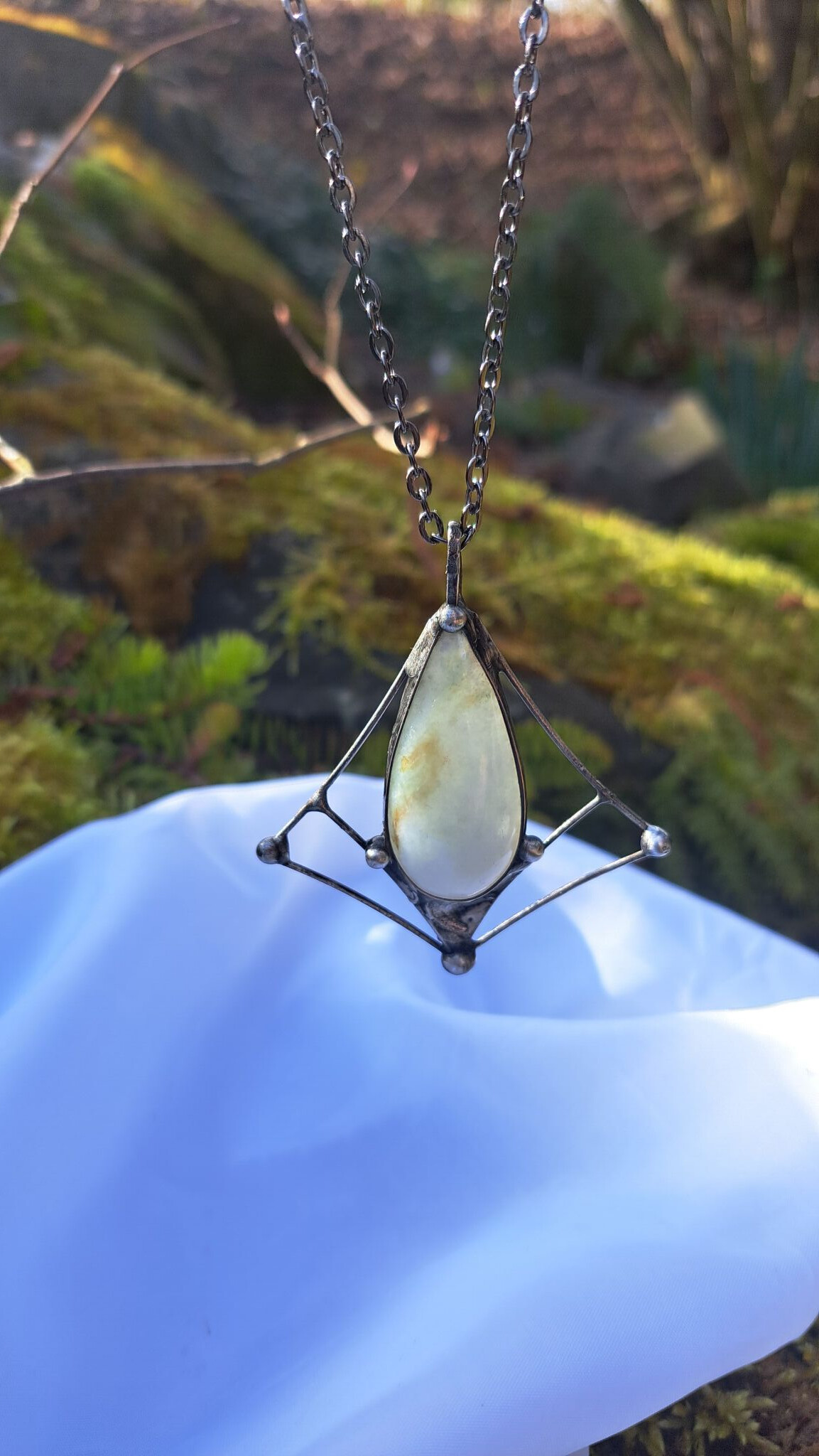 Krásný jemně zbarvený jadeit v ručně vyrobeném cínovaném přívěsku.