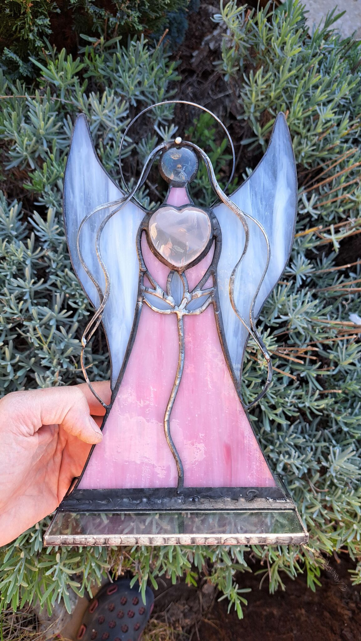Fascinující anděl s velkým srdcem z růženínu 4cm, vytvořen s maximální péčí a láskou a to stejné přinese i vám. Je vysoký 27cm a je na skleněném podstavci 14x8cm.