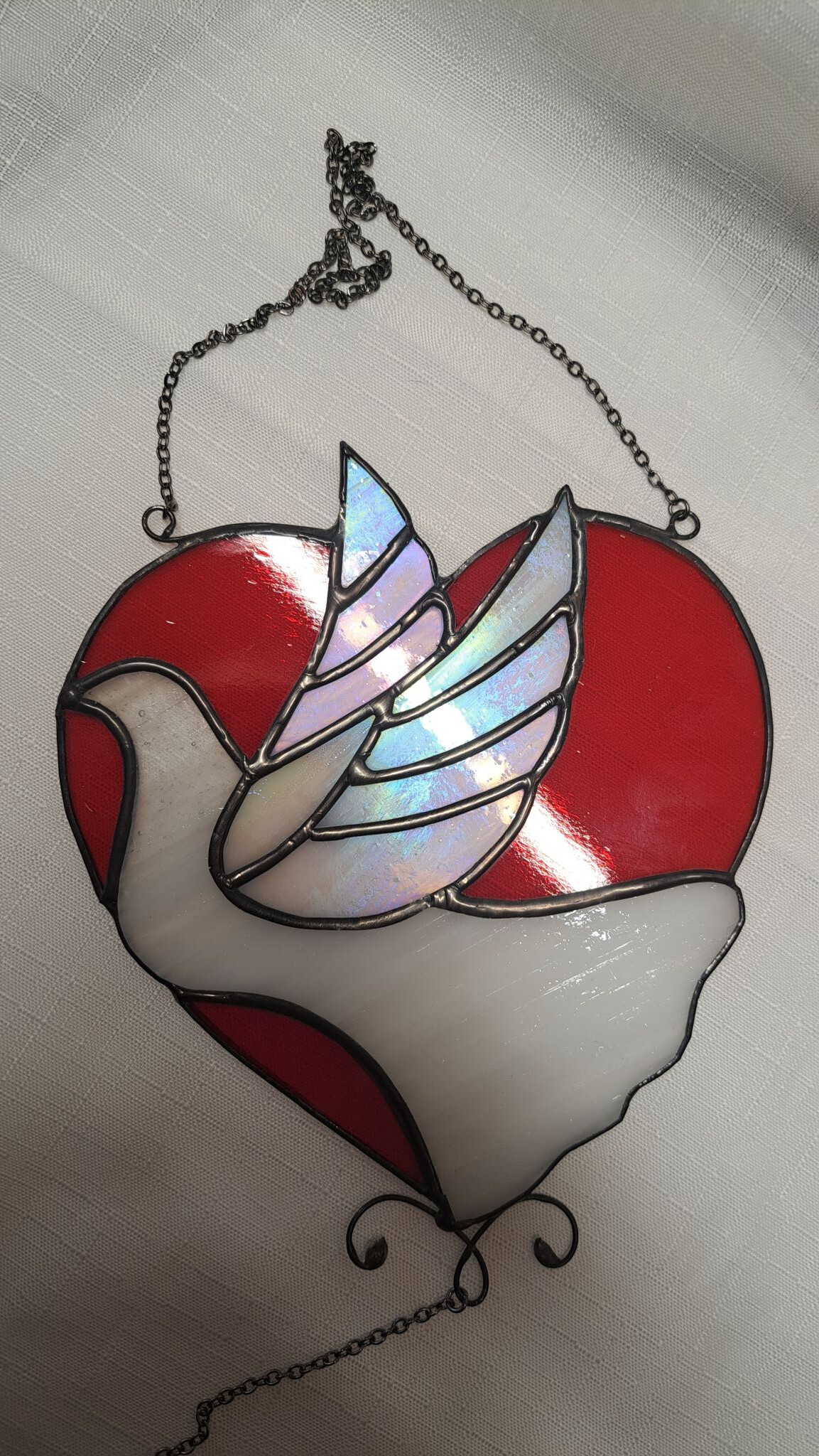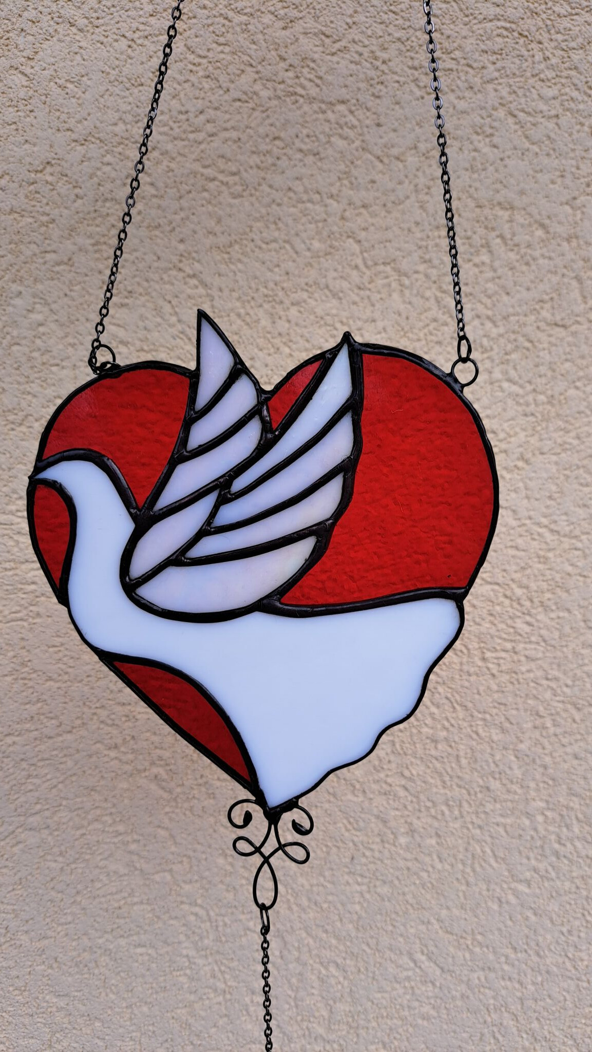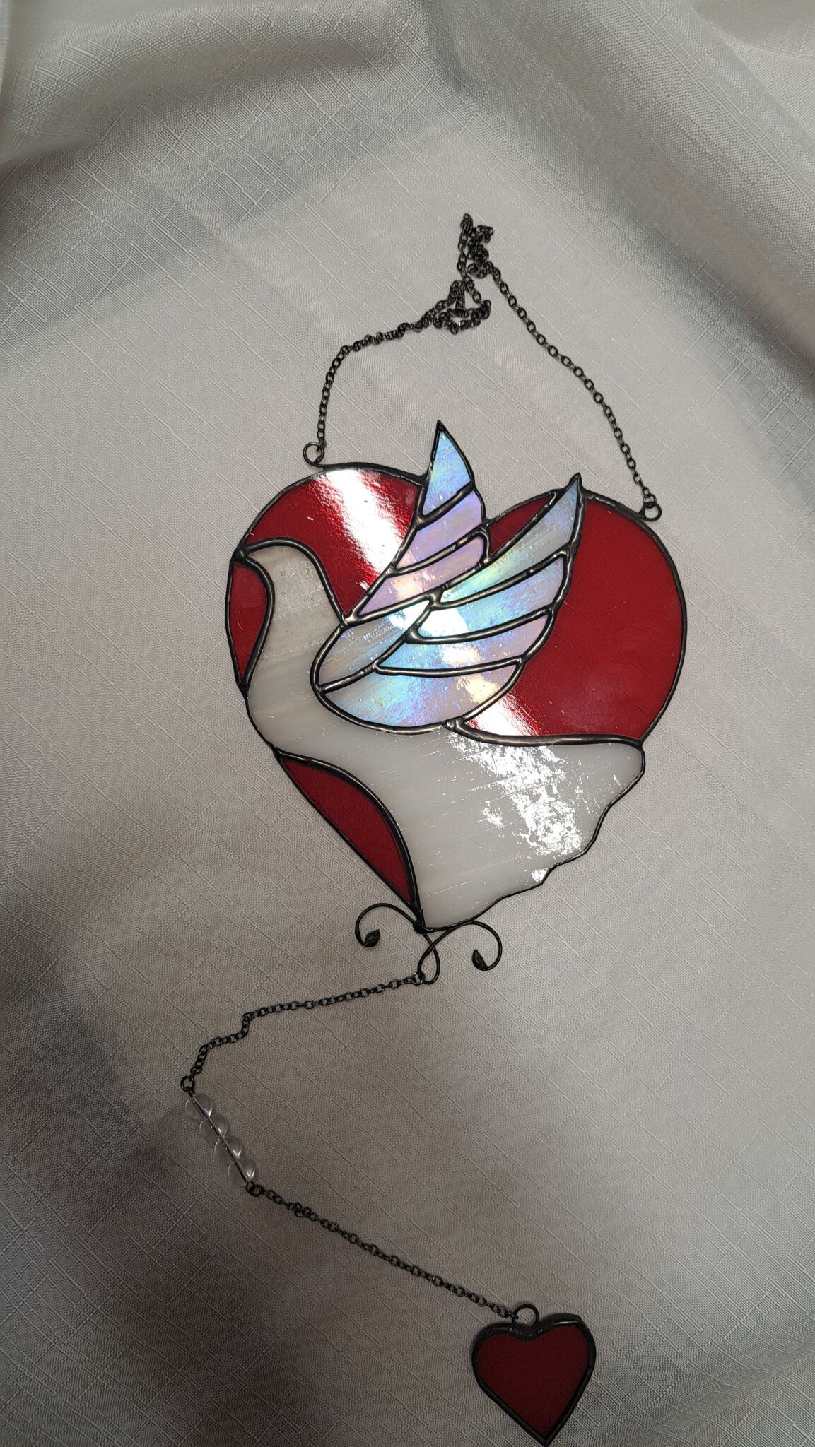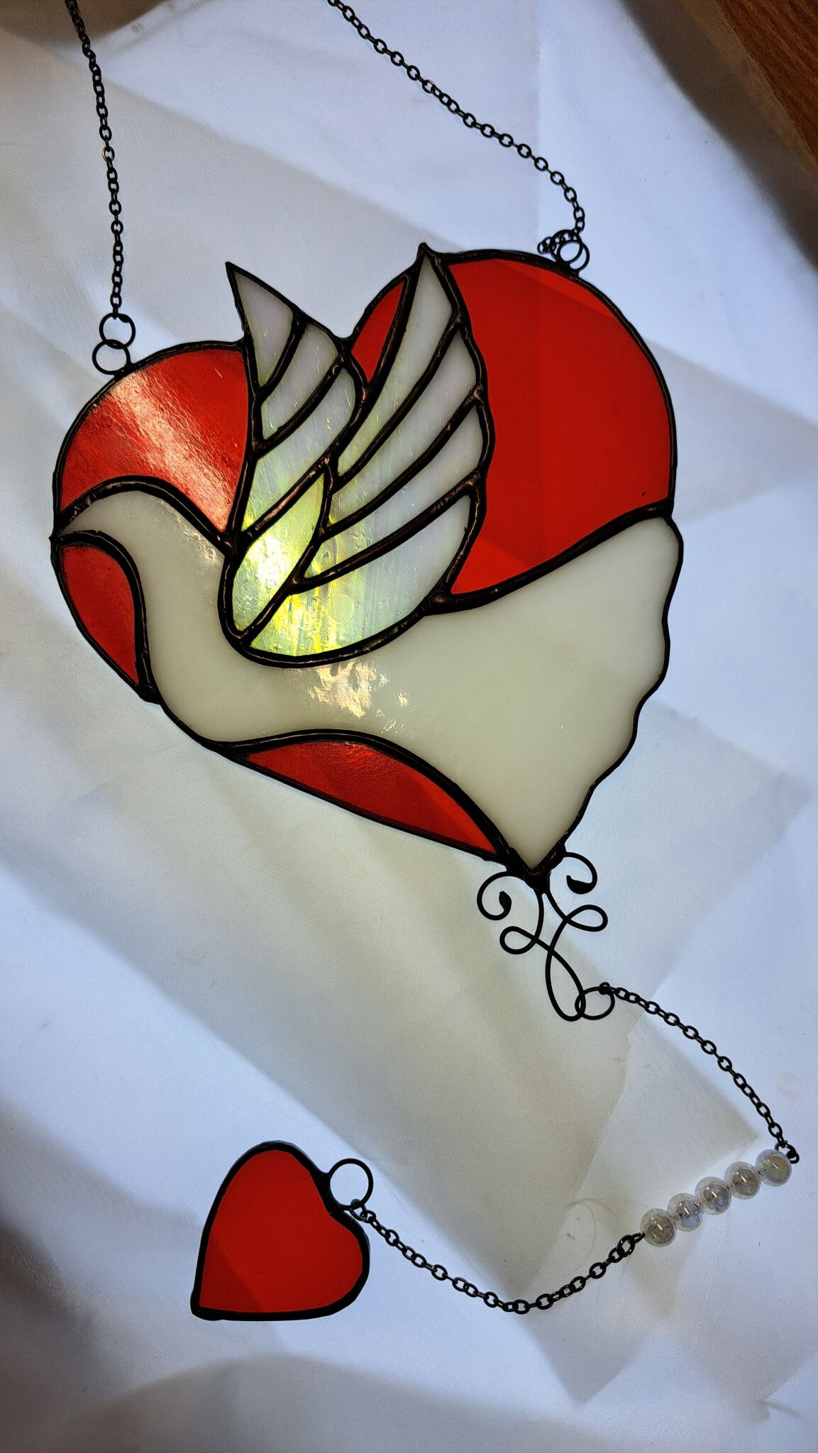 Krásné holubí srdce na zavěšení s křišťálovými korálky a malým srdíčkem.