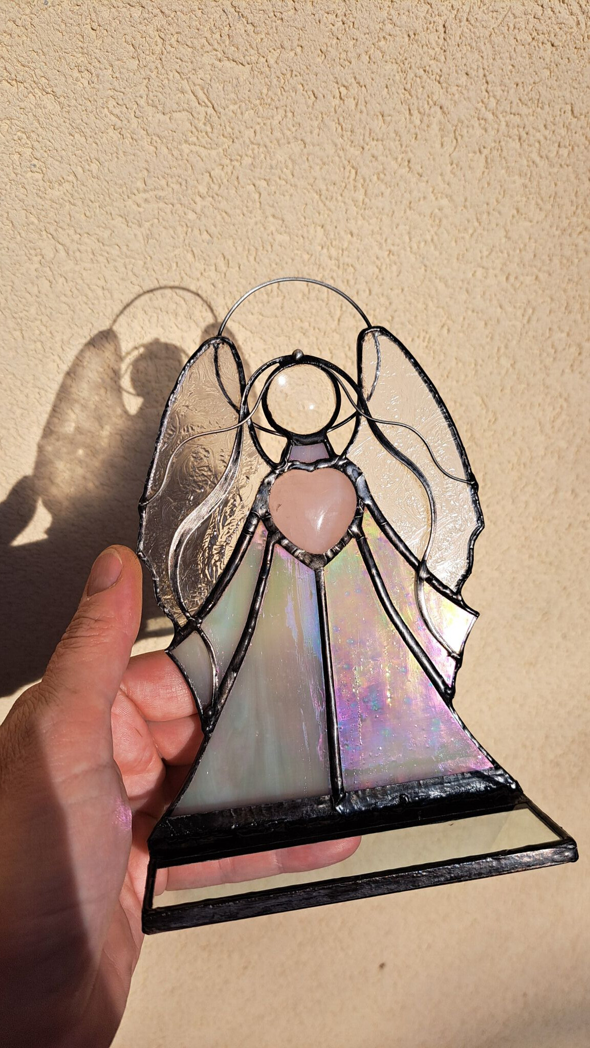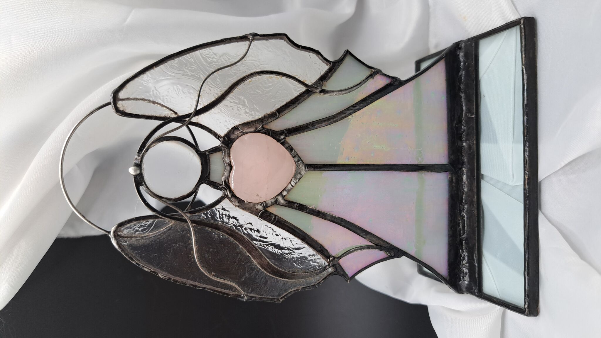 Anděl z vitrážového skla s růženínem v srdci. Kombinace opálového a irizujícího skla vytváří jemné odlesky při dopadu světla. Ručně vyrobený originál , který přináší do prostoru klid a harmonii.