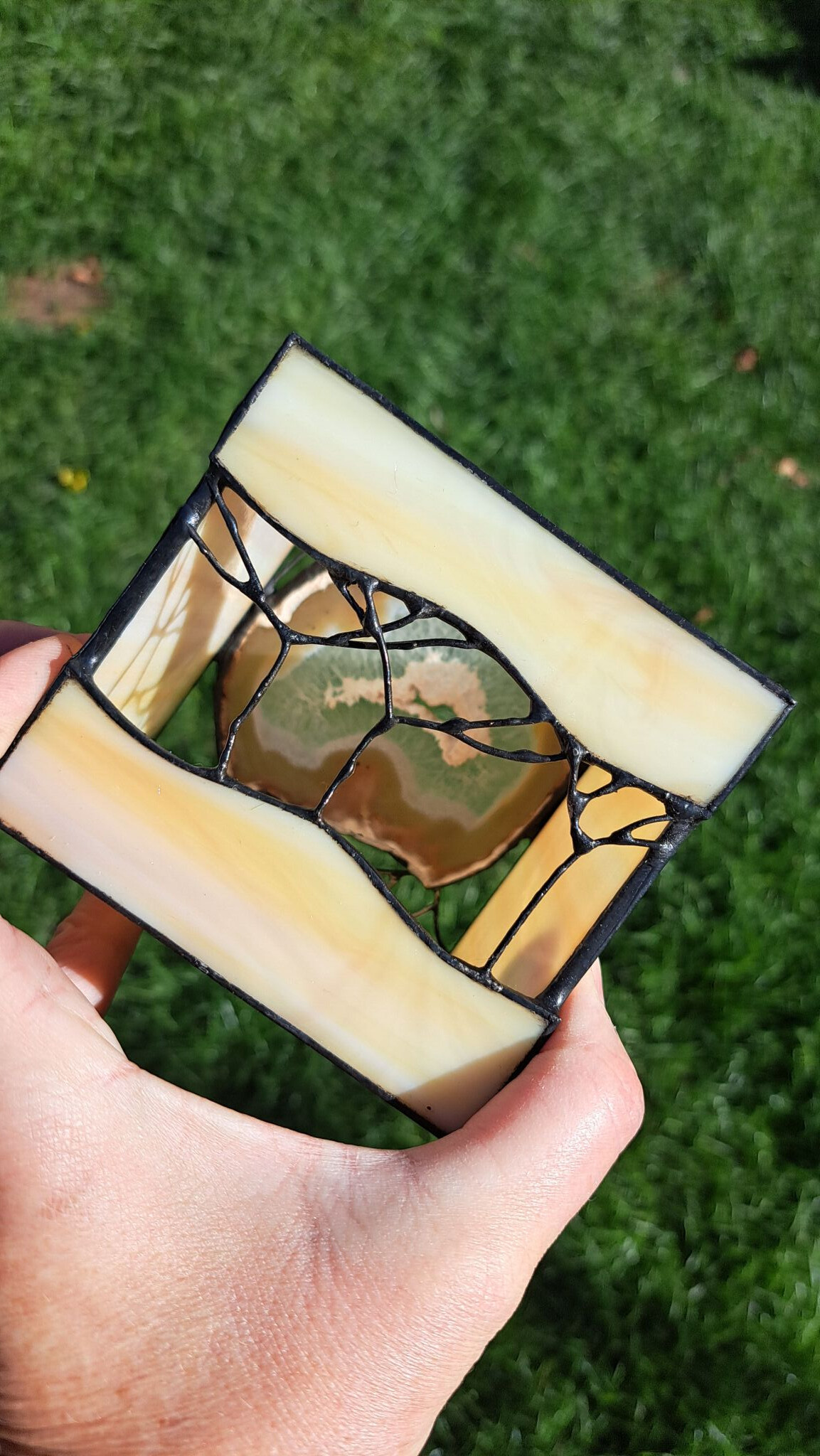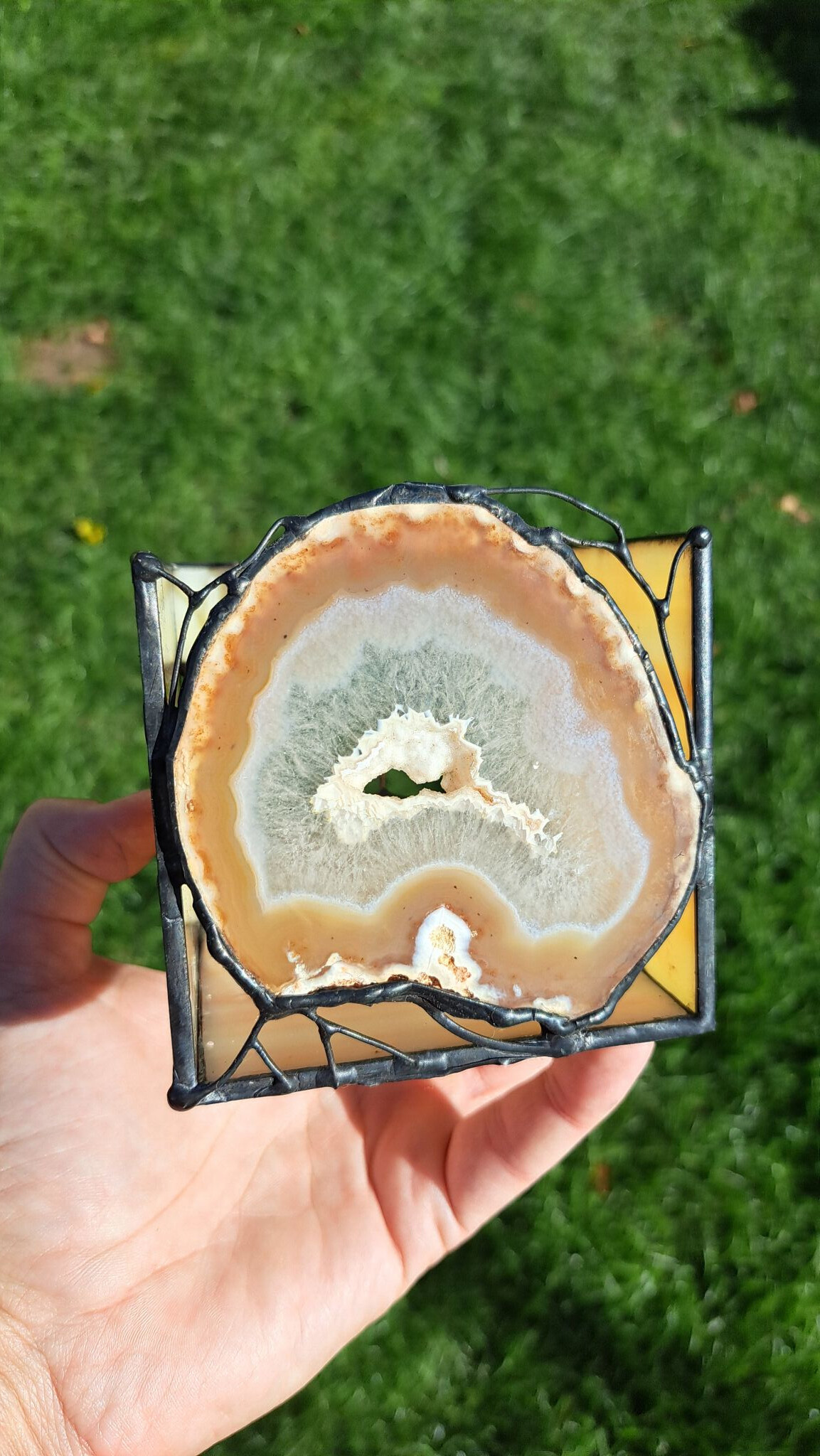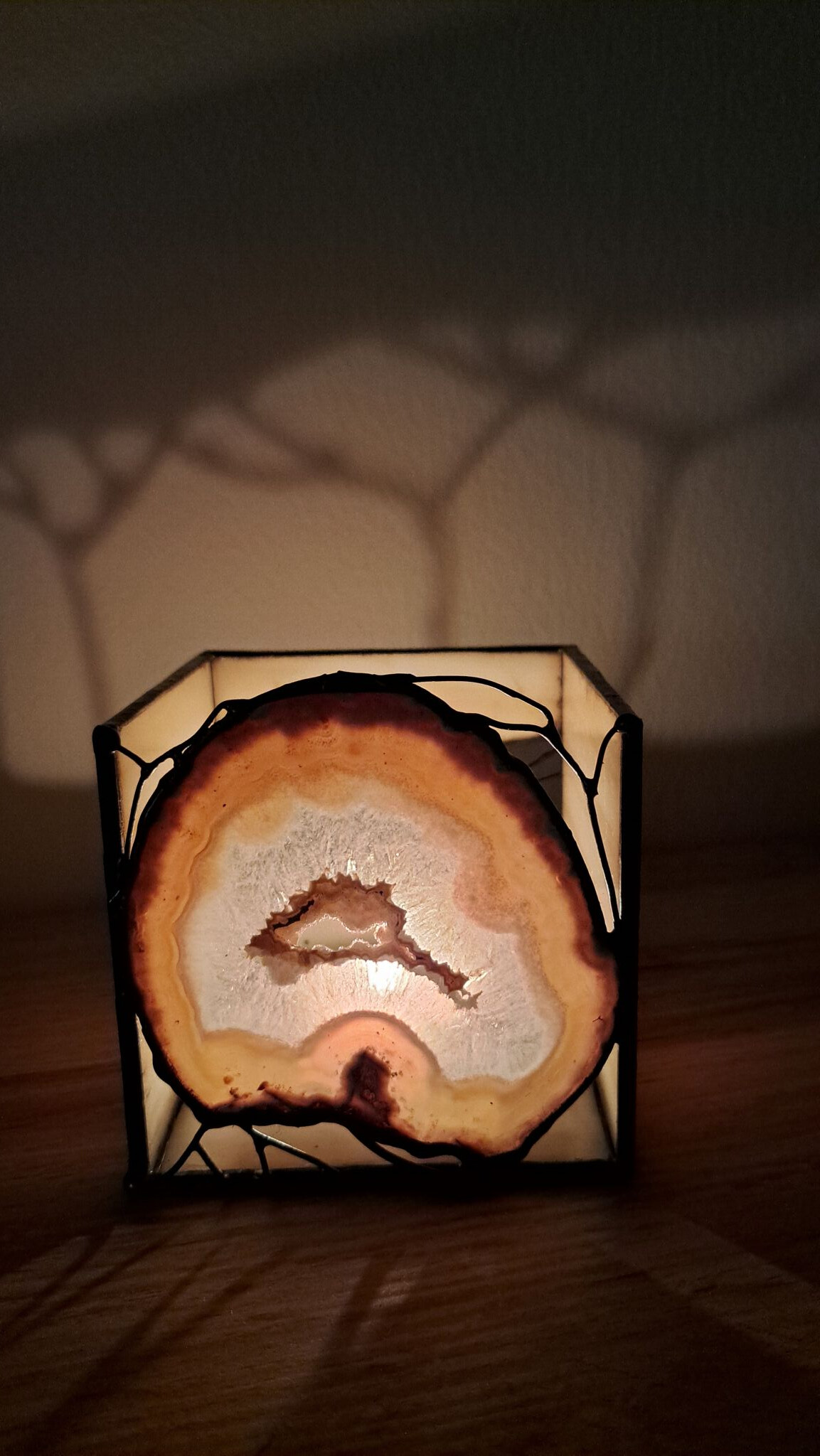 Ručně vyrobený svícen s jedinečným achátem s krystaly. Svícen je laděný do podzimních barev a jeho stínohrou jsou stromy. kouzlo tohoto svícnu vynikne s čajovou svíčkou, postavený blízko zdi, z jedné strany uvidíte zářící achát a druhá strana vás překvapí odrazem stromů.