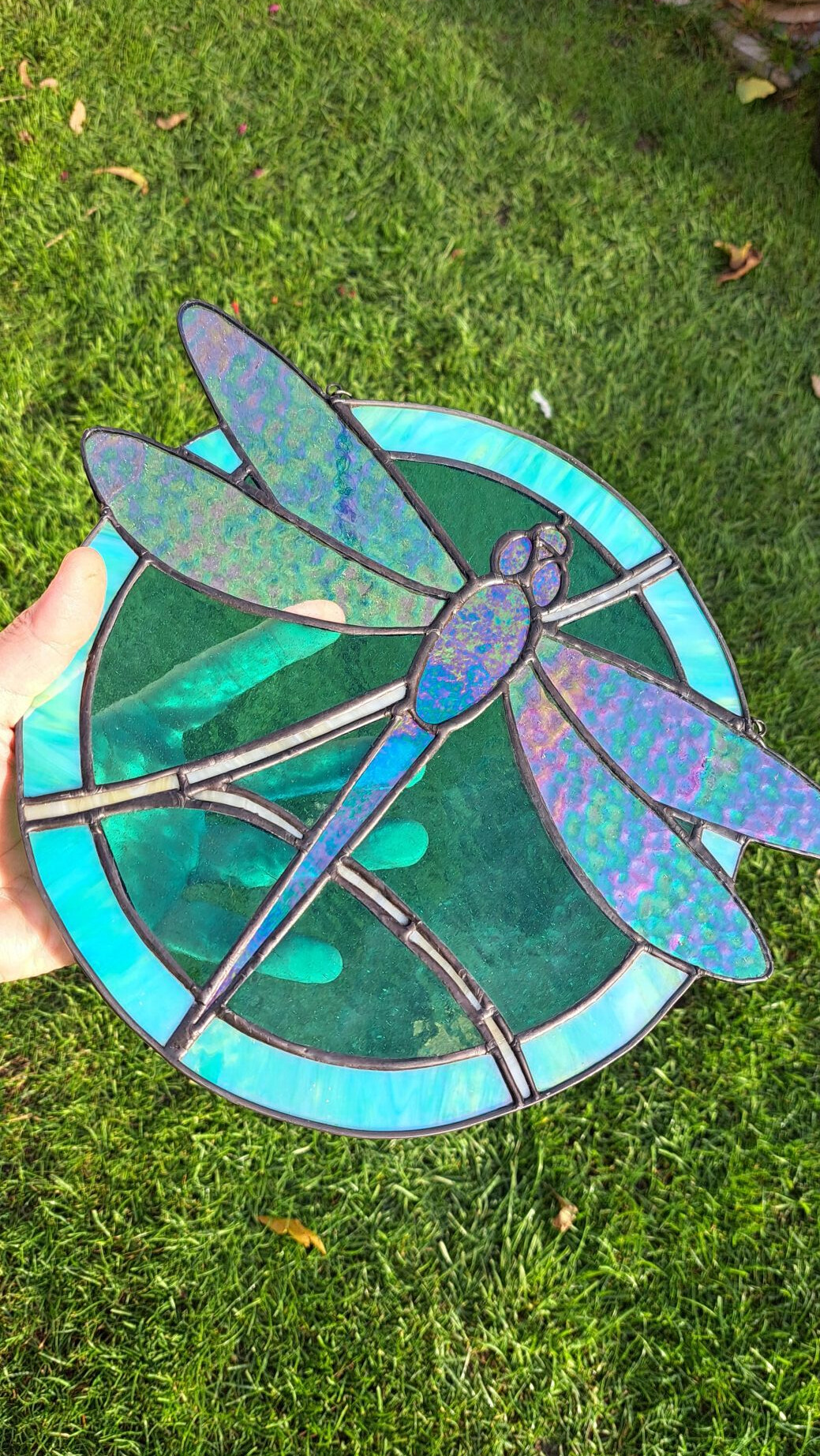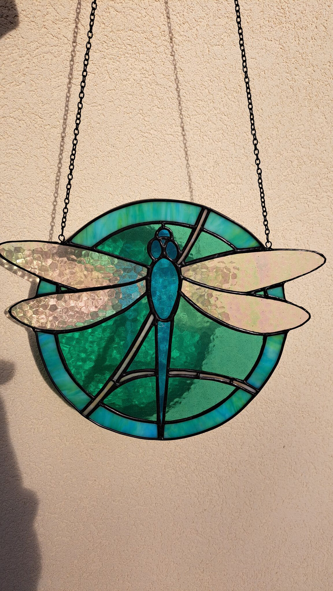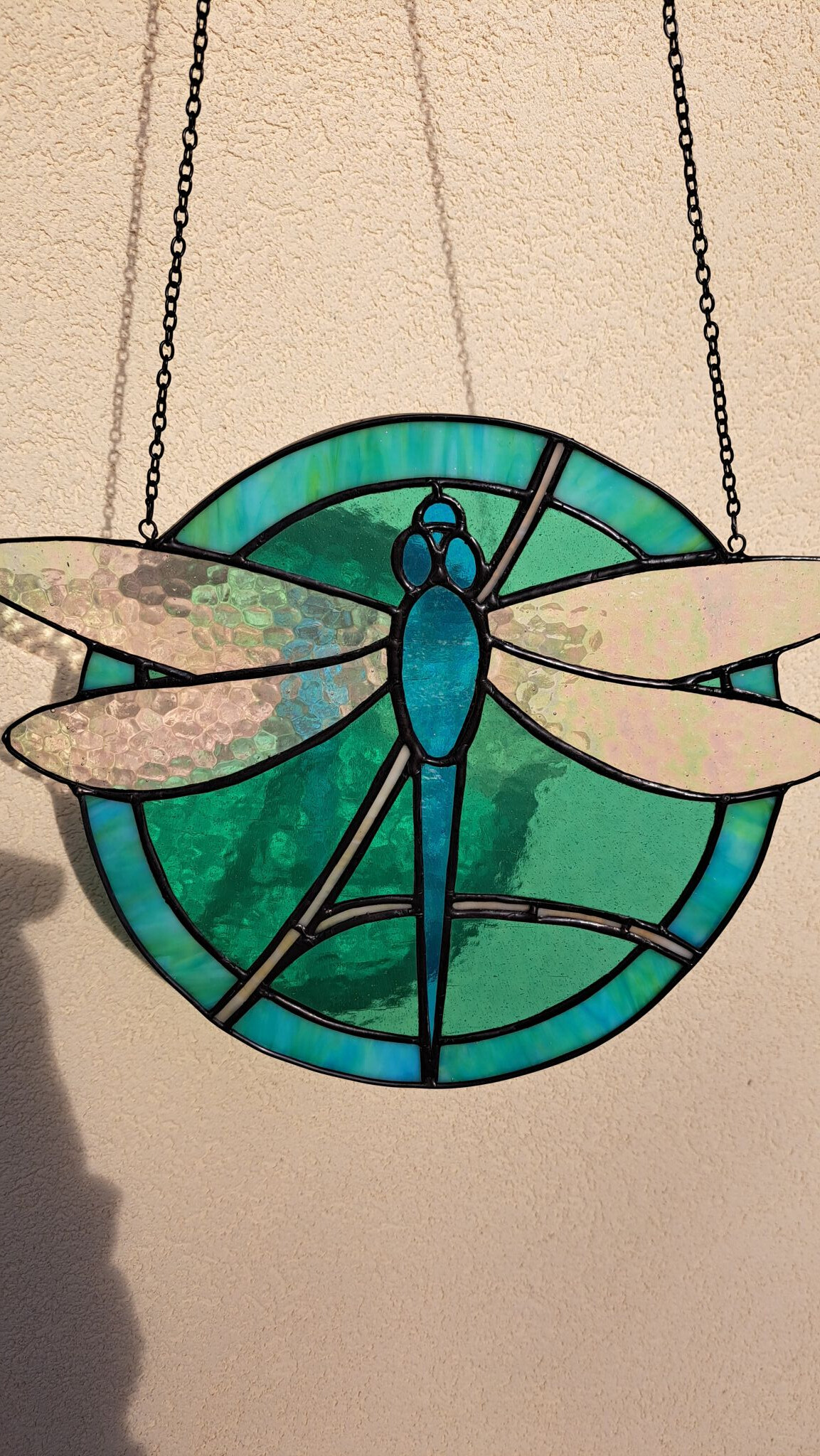 Tato originální ručně vytvořená vitráž je v kombinaci zelených irizujících skel. Průměr kruhu je 27cm a rozpětí křídel vážky je 33,5cm.