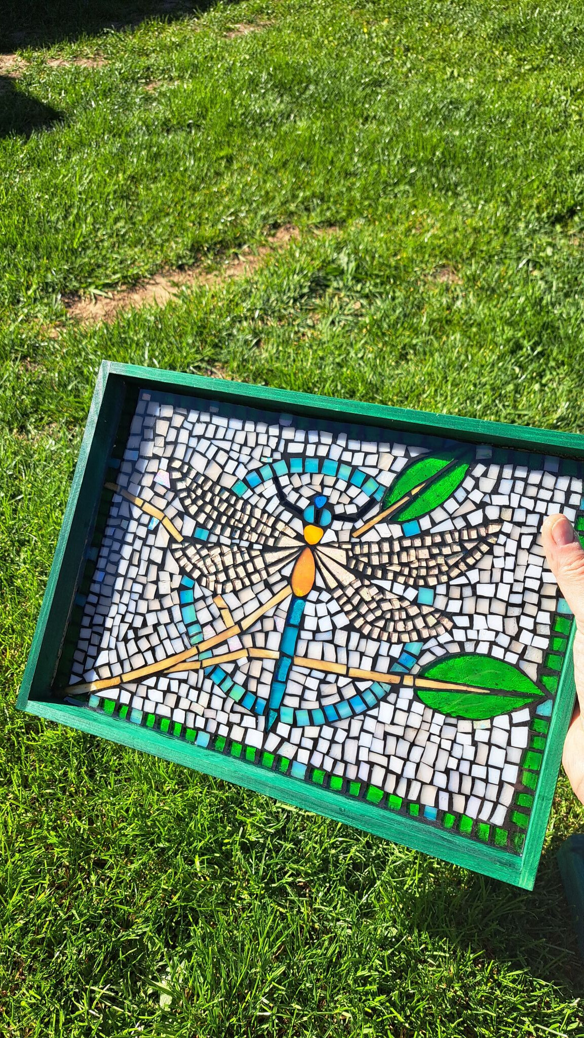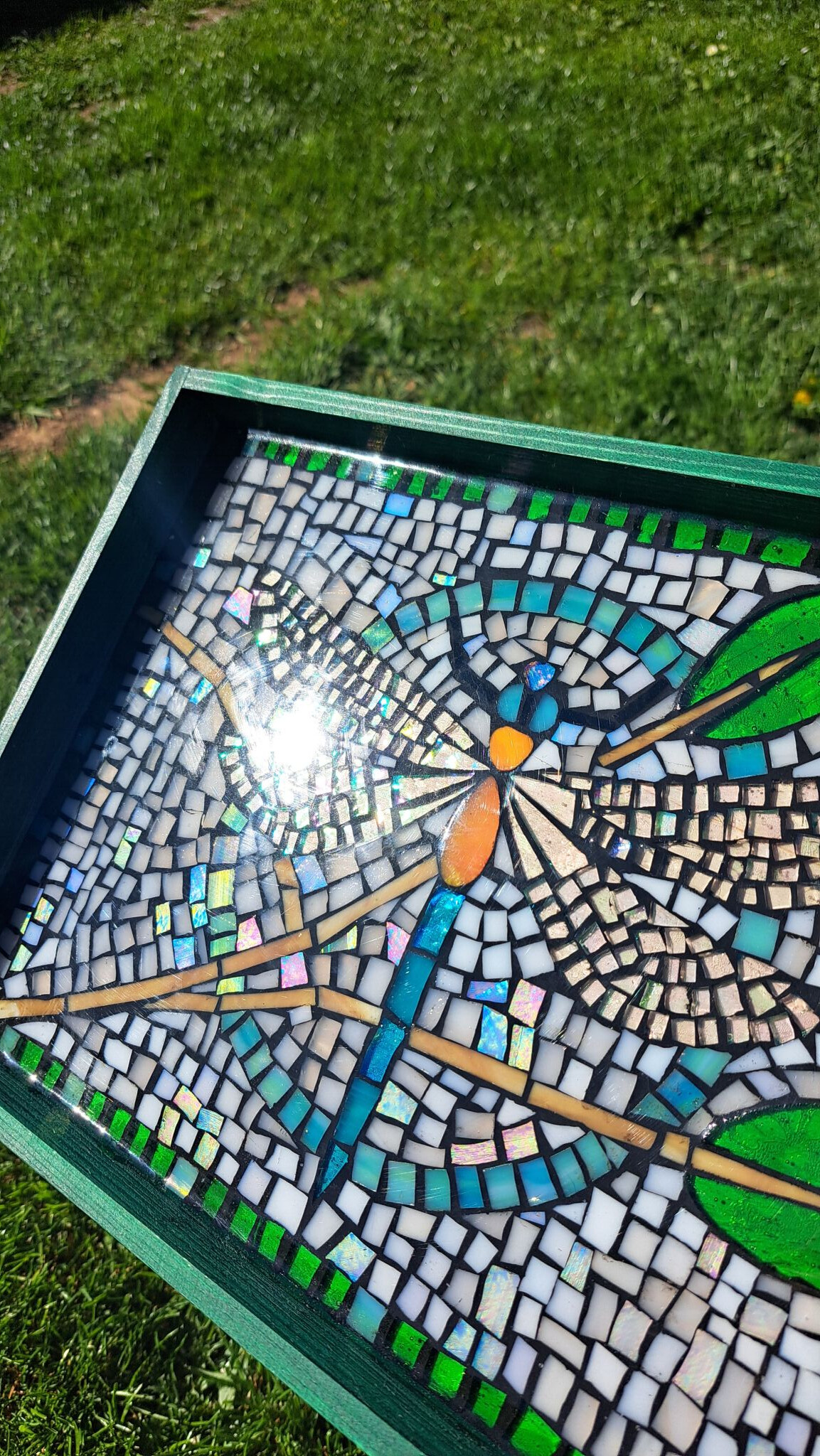 Originální dřevěný podnos se skleněnou mozaikou zalitou křišťálovou pryskyřicí.