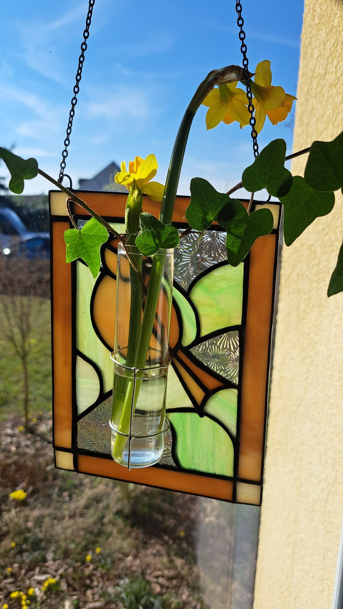 Malá vitráž do okna s vrabečkem není jen dekorací , ale i praktickým místem pro umístění rostliny, např. oddenku a to díky skleněné zkumavce umístěné v zadní části. Tato zkumavka lze vyndat .