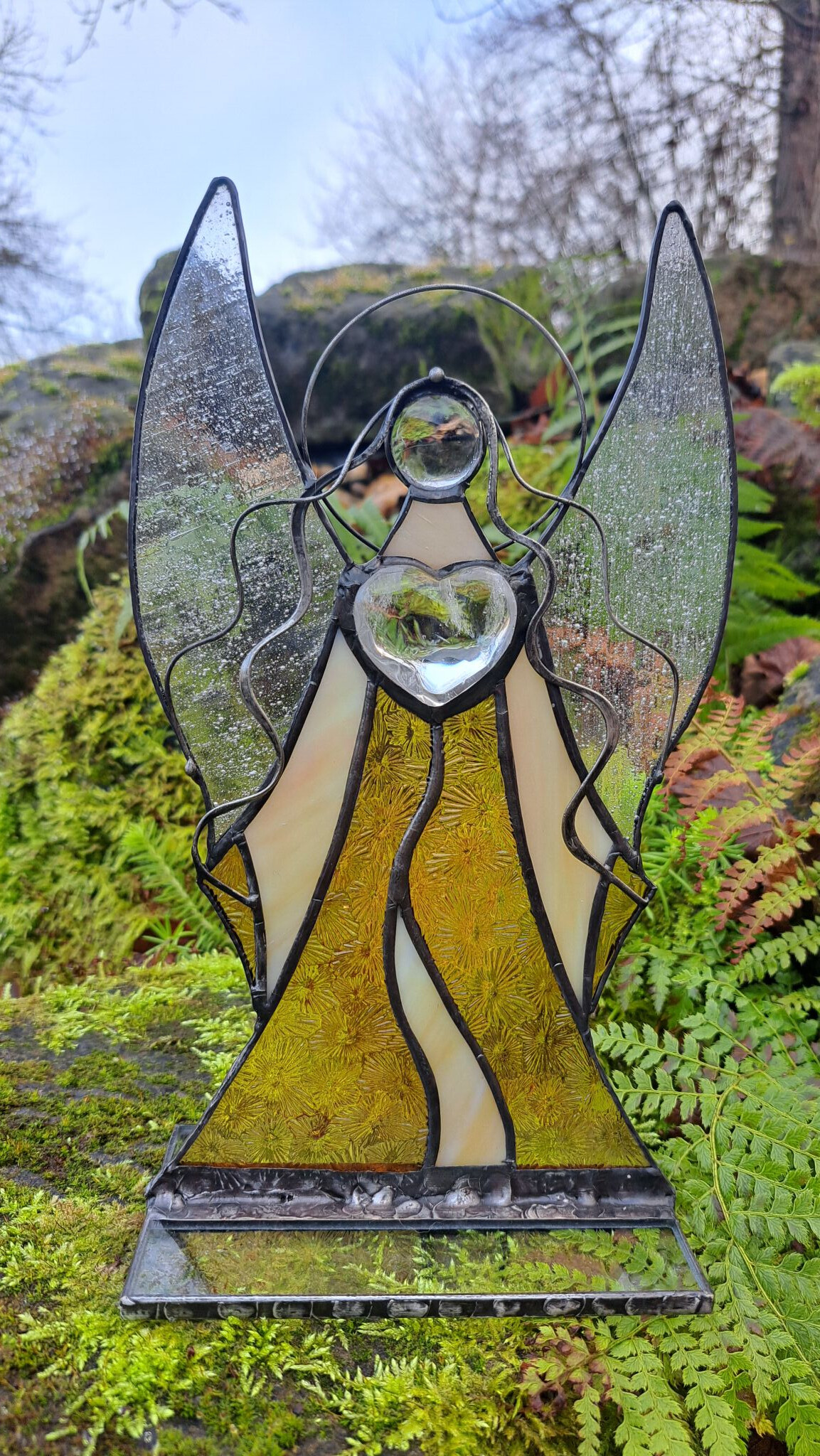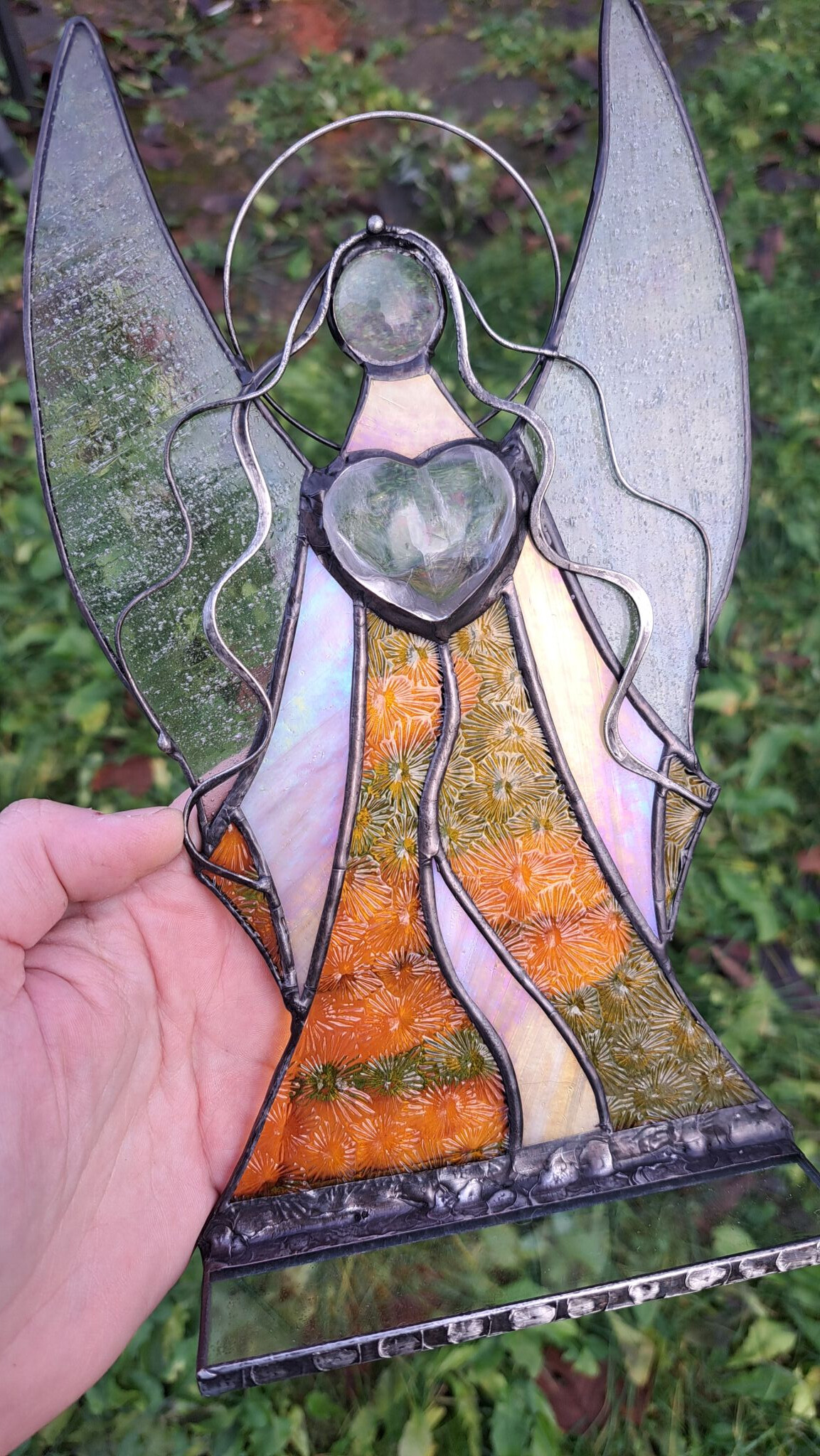 Velký a jedinečný anděl, který si Vás okamžitě získá. Medové sklo s kvítky v kombinaci s duhově zlatým sklem a velikým srdcem z průzračného křišťálu překvapí svou velkorysou silou a stane se středobodem prostoru ve kterém bude sídlit. Možná zaznamenáte jeho jemné šaty a krásné vlasy jako odkaz secese, romantiky či jen pohádkové krásy, záleží na vaší fantazii a vašich vlastních skrytých odkazech, který každý z nás máme ukryté v podvědomí.